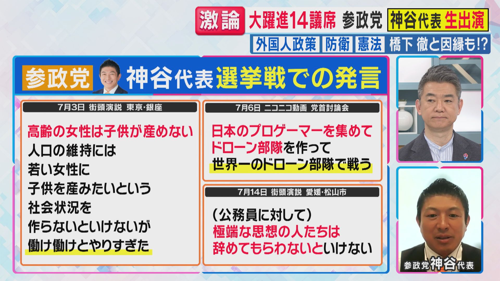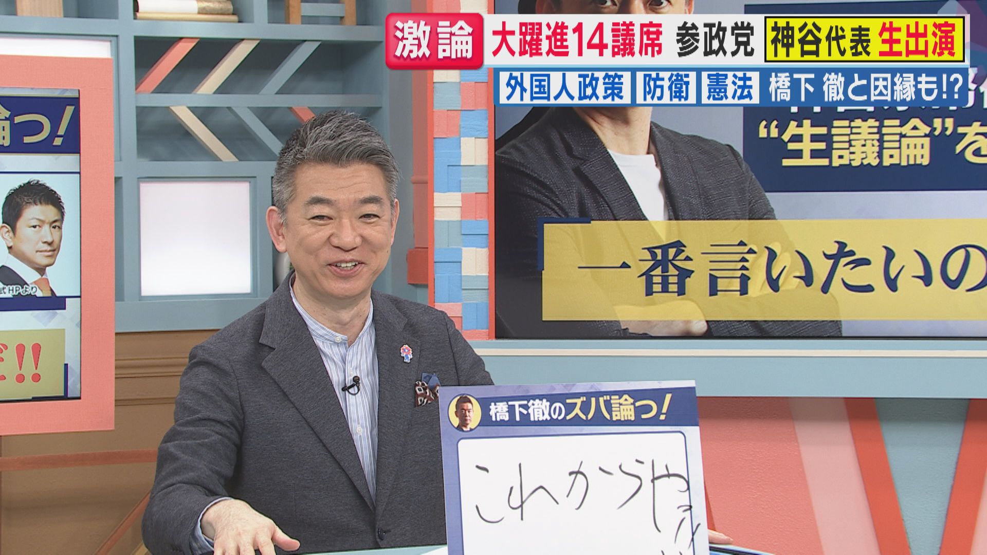 【参政党・神谷代表】「橋下さん、そうやって数字数字っておっしゃいますけども。我々今初めてこれだけの数をいただいてですね。これからブレーンや政策チーム作っていきながら数字を出していこうという形でやっています。