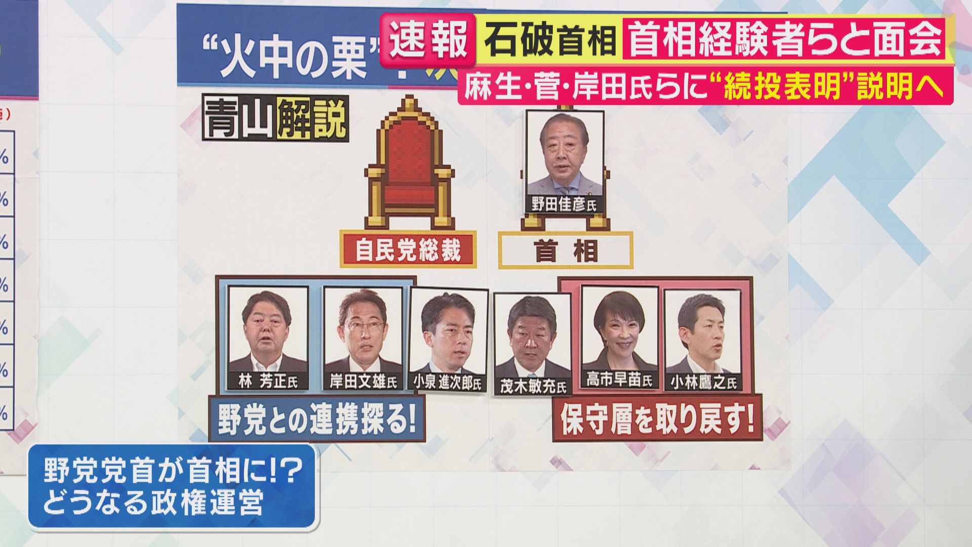 【青山和弘さん】「国民民主党と組めばそうだし、例えば野田さんの立憲民主党でもいいわけです。このあたりの交渉がどう進むかも、誰が総裁になるかでやっぱり変わってくるんですね。