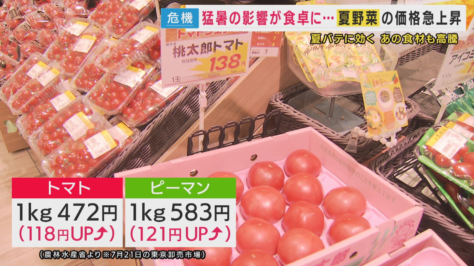 夏になると食べたくなるのが、爽やかな夏野菜。 しかし、農林水産省によると、その価格はトマトが1キロ当たり472円と平年より118円、ピーマンが583円と平年より121円高くなっています。