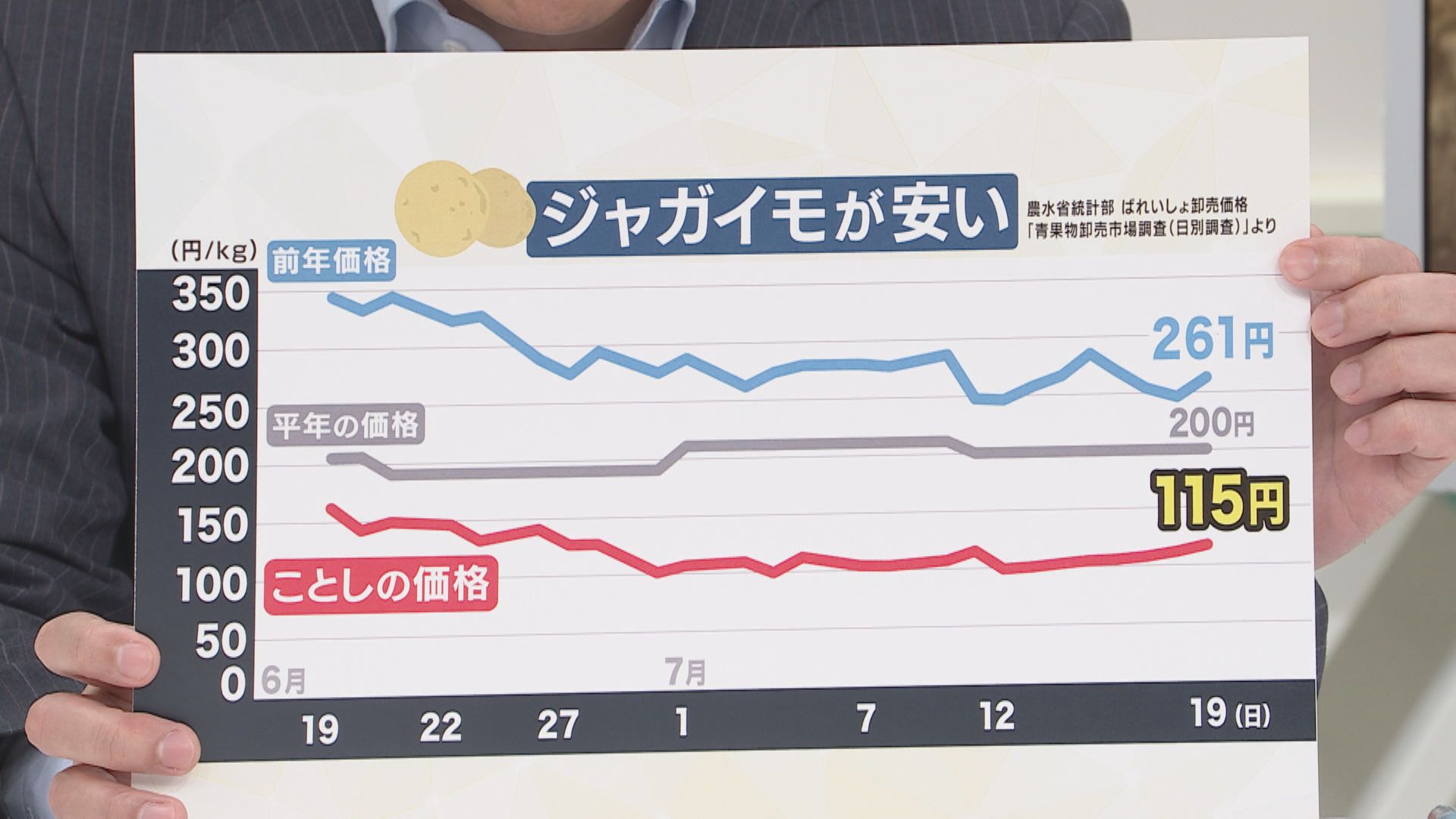 食卓の救世主となりそうなのが「ジャガイモ」で、去年の同時期より1キロ当たり150円ほど安くなっています。