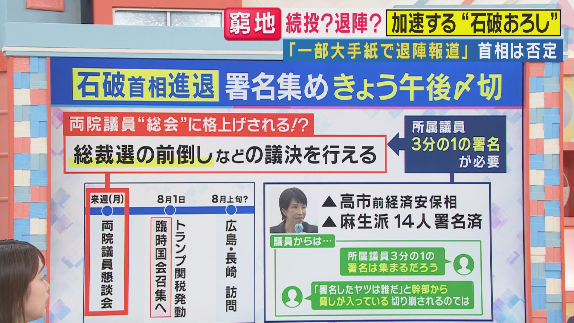 【関西テレビ 神崎博報道デスク】「両院議員『懇談会』というのは予定されてるんですけど、これはただの『懇談会』です。例えば、石破さんをリコールしようと思ったら、『総会』に格上げしなければいけません。そのためには、所属議員が大体自民党で300人ぐらいいるんすけど、3分の1なので100人ぐらいの署名を集めなければいけない。今必死に集めようとして、今は14人と高市さんで、15人分ぐらい集まっています。100まで行かなければいけないので、多数派工作が党内で、『誰が署名していない』とか、『署名絶対するなよ』とかが今、中で行われています」
