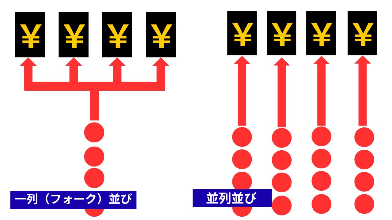 レジの並び方には大きく2種類、「並列並び(パラレル並び)」と「一列並び(フォーク並び)」の方式があります。