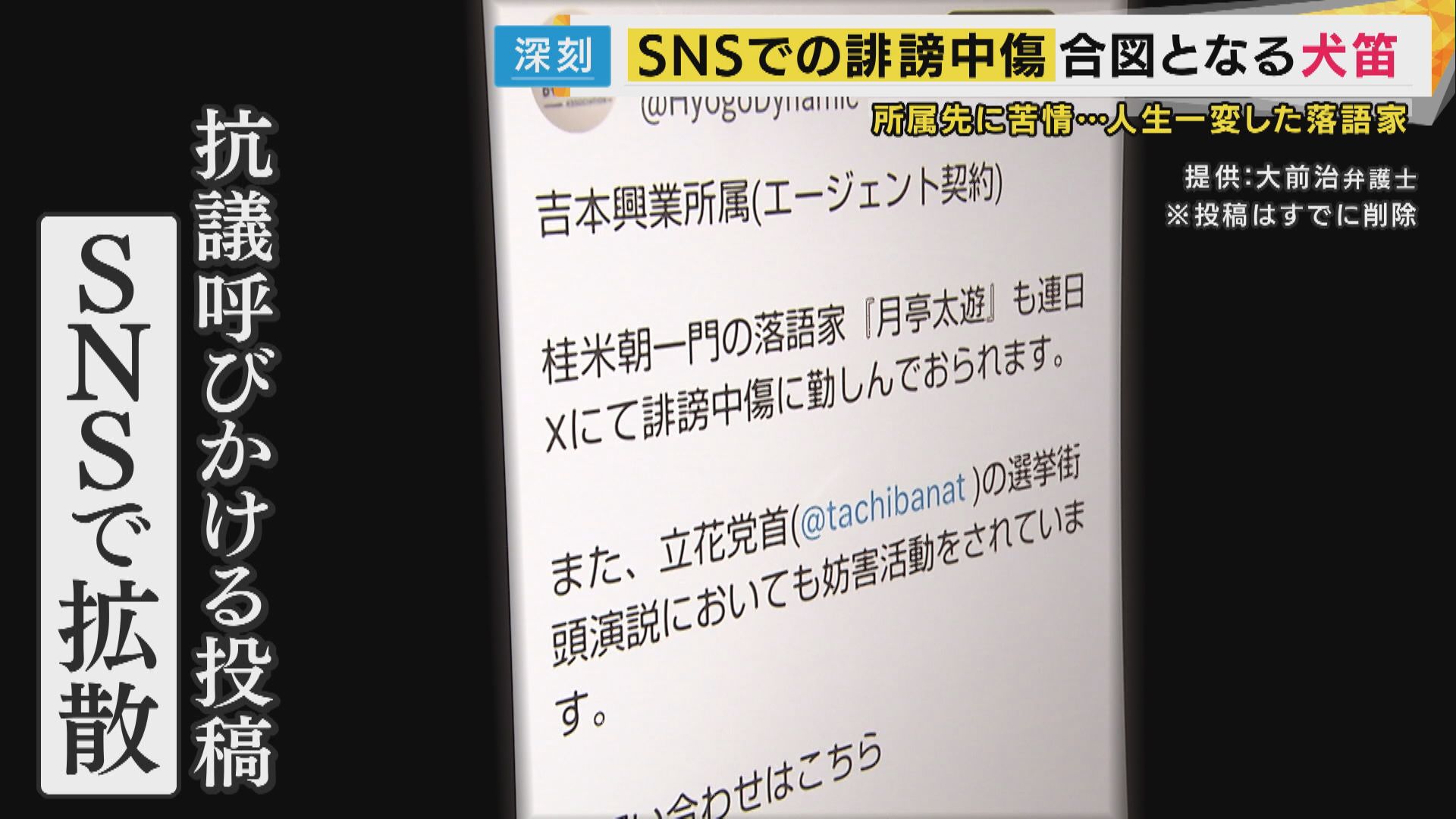 【「X」での弁護士・大前治さんの返信】「吉本興業と落語協会の電話番号を記載しており、抗議や苦情の電話を呼びかける意図は明らかです。威力業務妨害に該当する行為を招く違法行為です」