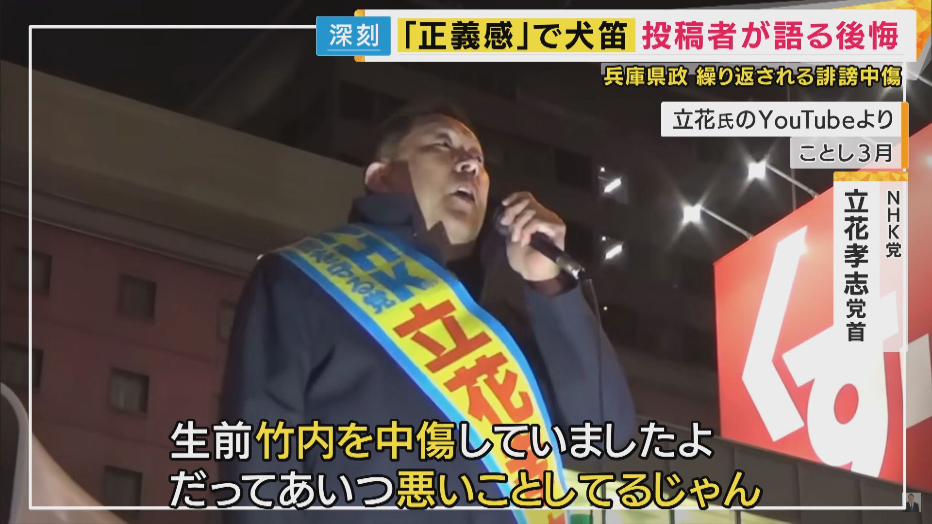 【NHK党・立花孝志党首(本人のYouTubeの発言より・ことし3月)】「生前、竹内を中傷していましたよ。だってあいつ、悪いことしてるじゃん」