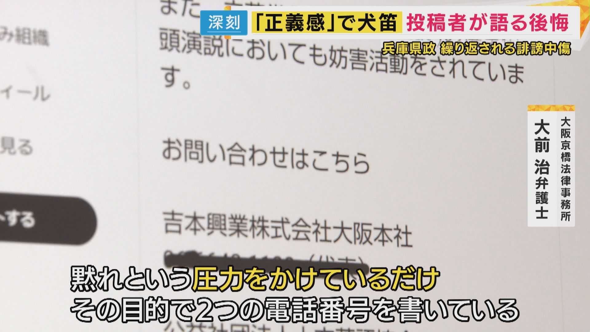 【大阪京橋法律事務所・大前治弁護士】「『あなたの考え方はこういう理由で間違ってますよ、これが正しい考え方ですよ』という意見をぶつけ合うんじゃなくて、『黙れ』という圧力をかけてるだけですよね。その目的で2つの電話番号を書いている。これは恐ろしいなと」