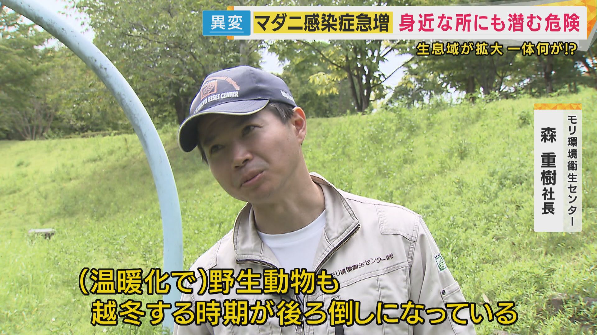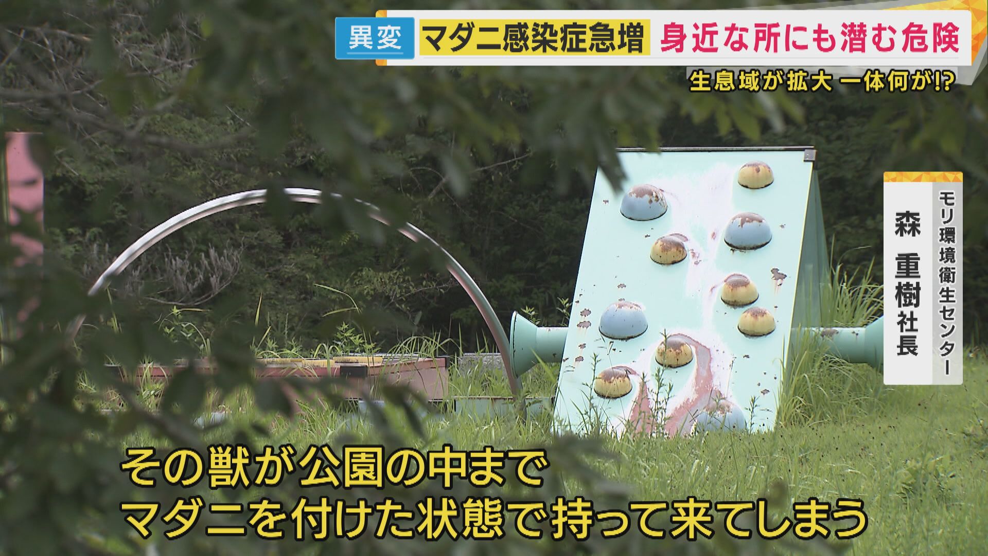 【モリ環境衛生センター森重樹社長】「当然、山にはマダニと野生動物、獣がいます。その獣が公園の中までマダニをつけた状態で持ってきてしまう」