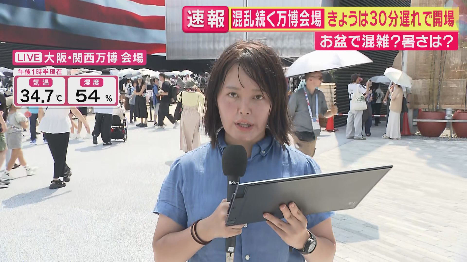 【中橋記者】 「午後1時半現在、35度ほどと非常に暑いです。私は午前7時ごろから取材しているんですけれども、服の色が変わってしまうほど汗をかいています。改めて、きのう巻き込まれてしまった人たちは大変だっただろうと実感しています。お盆休みということもあって、非常に人が多いんです。こちらのアメリカ館は2時間待ちです。
