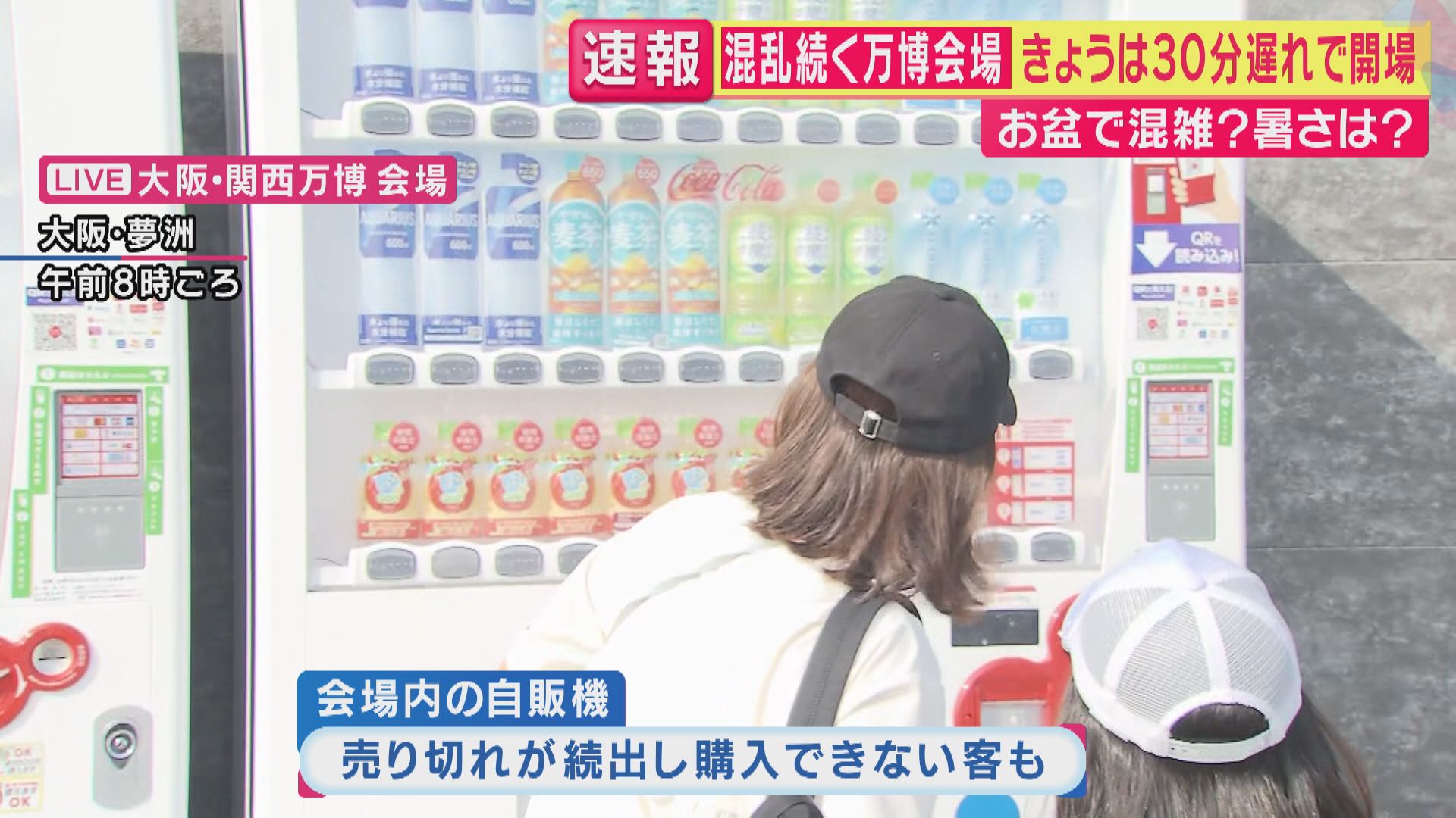 【中橋記者】「けさは万博会場自体のオープンが普段より普段より30分遅れました。多くの人が炎天下で待ち続ける中、問題となったのは飲み物の自動販売機です。万博会場で一夜を過ごした人もいたため、自動販売機は私が見たものはすべて売り切れとなっていました。