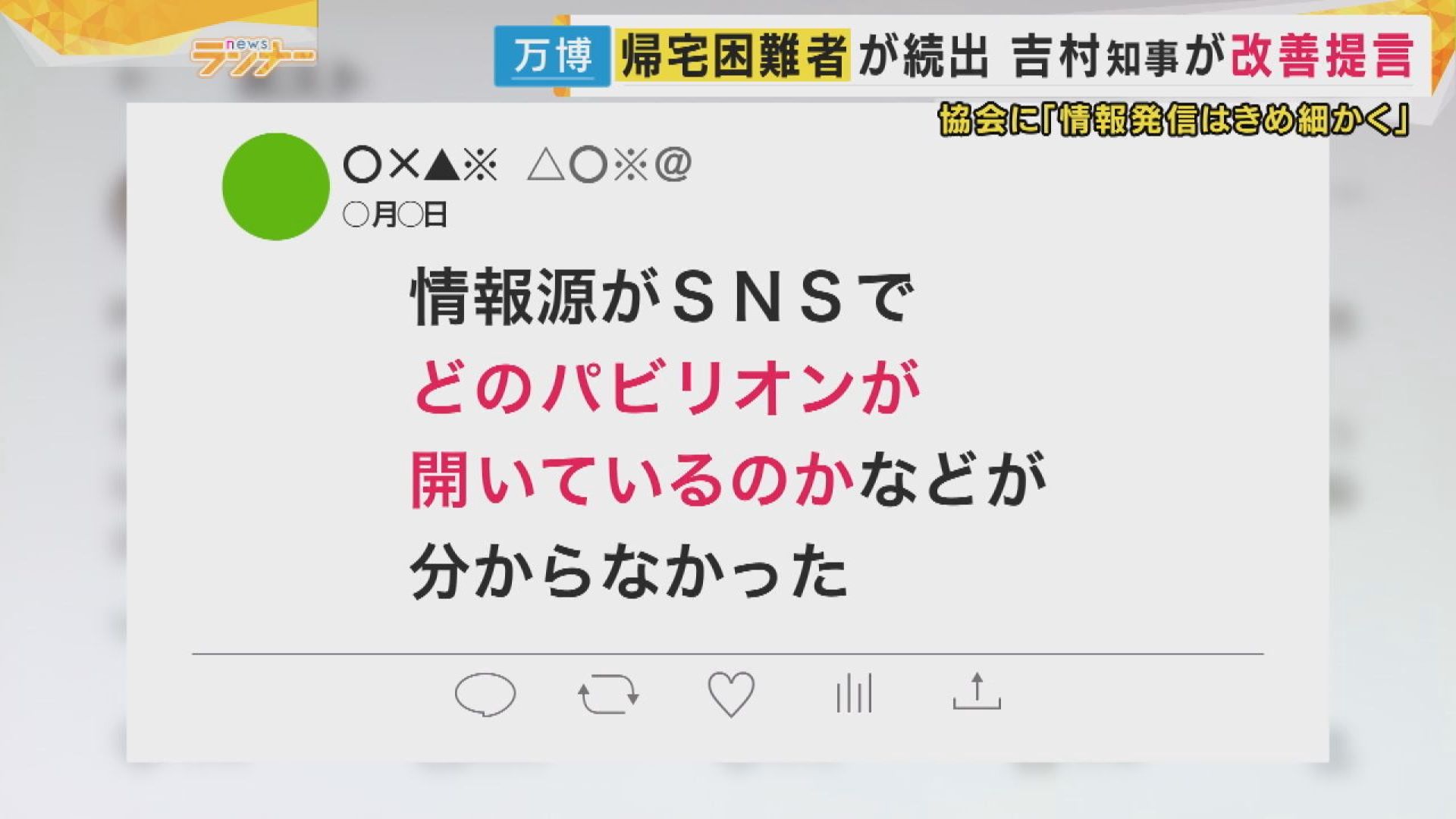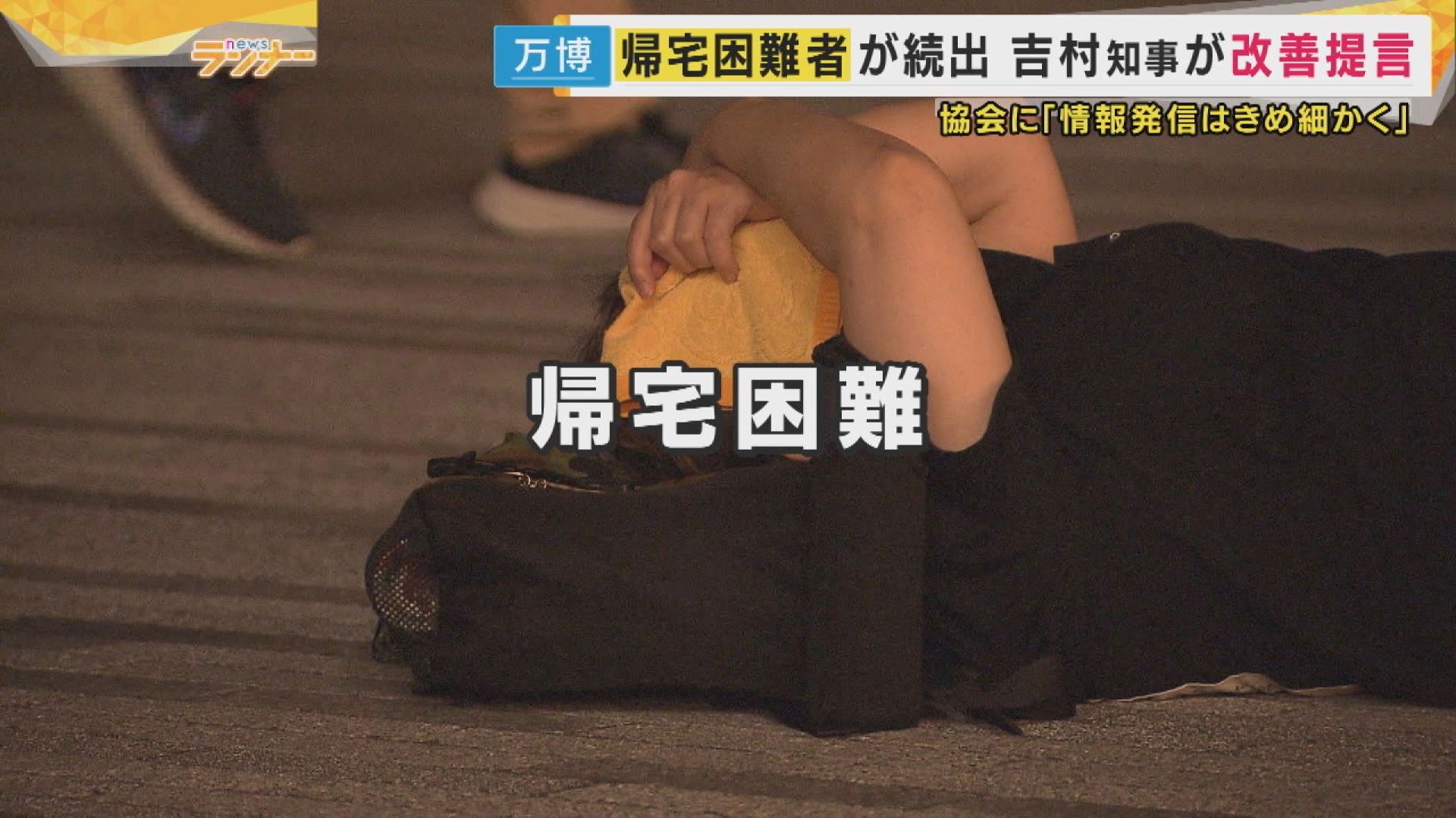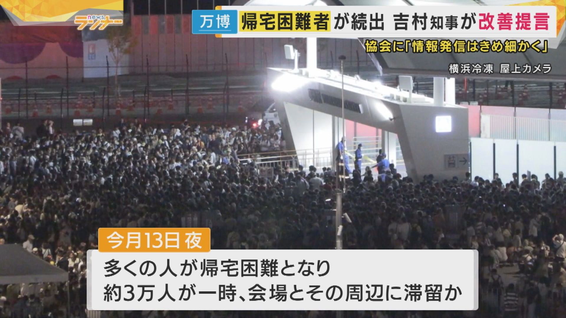 万博会場で今月13日に多くの人が帰宅困難になった問題で、大阪府の吉村知事は18日、情報発信のあり方などを改善するよう博覧会協会に提言したと明らかにしました。