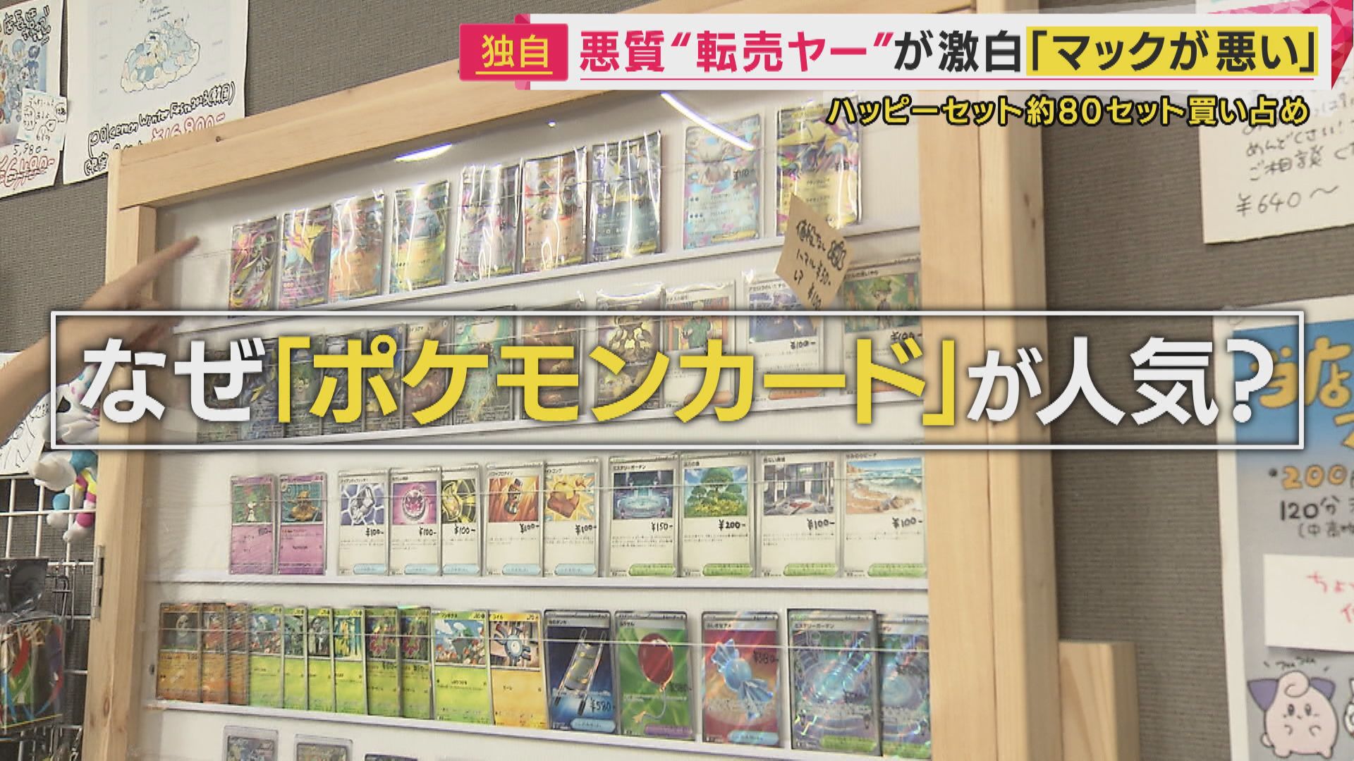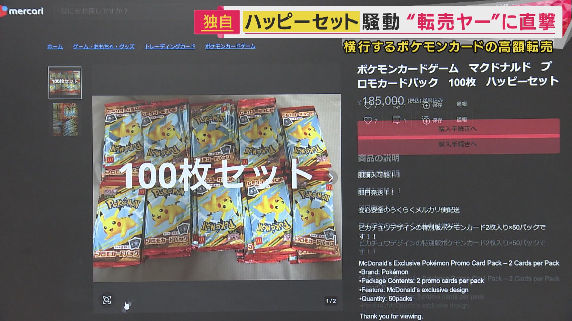【記者リポート】「メルカリには、多数のポケモンカードが出品されていまして、中には100枚セットが18万5000円のものもあります」