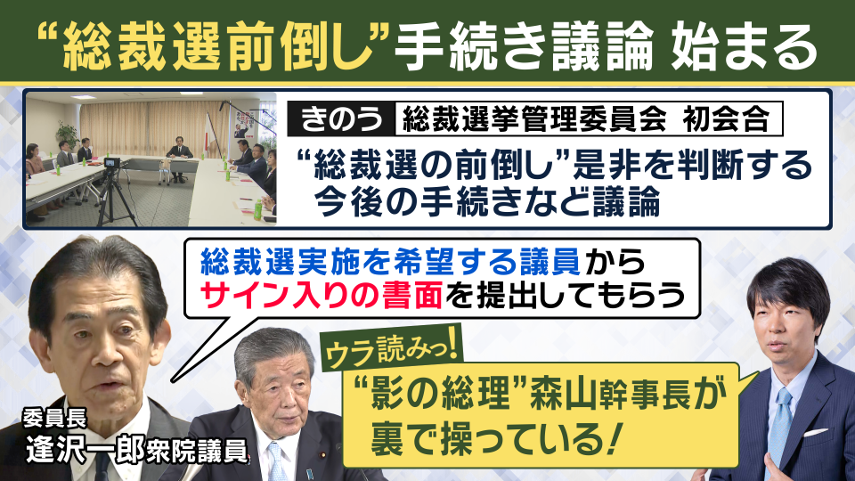 選挙管理委員会は、総裁選の前倒しの是非を判断する手続きを今後議論していきますが、逢沢一郎委員長は「総裁選実施を希望する議員から、サイン入りの書面を提出してもらう」と発言しています。