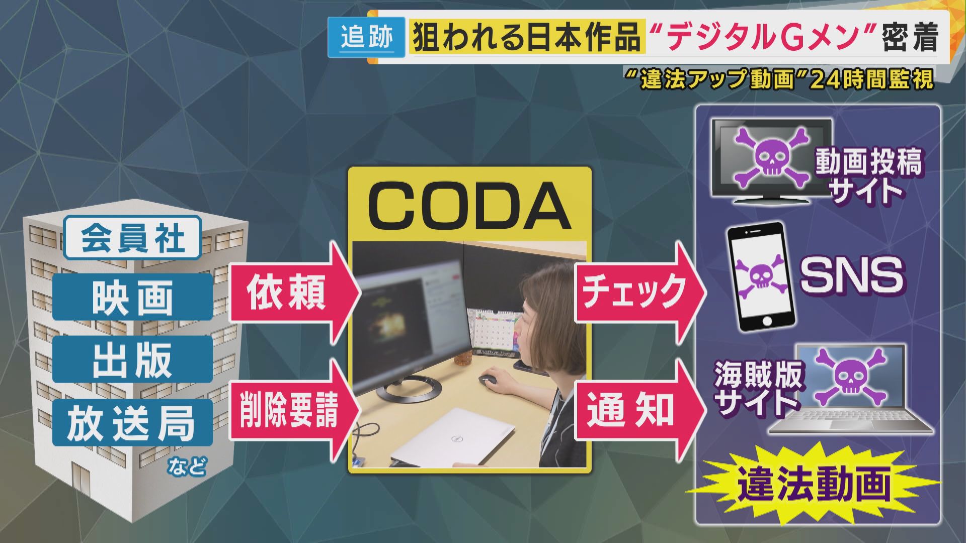 CODAは映画会社や、出版社などの会員社から依頼を受け、動画投稿サイトやSNS、海賊版サイトなどあらゆるプラットフォームをチェックし、違法動画を見つけます。