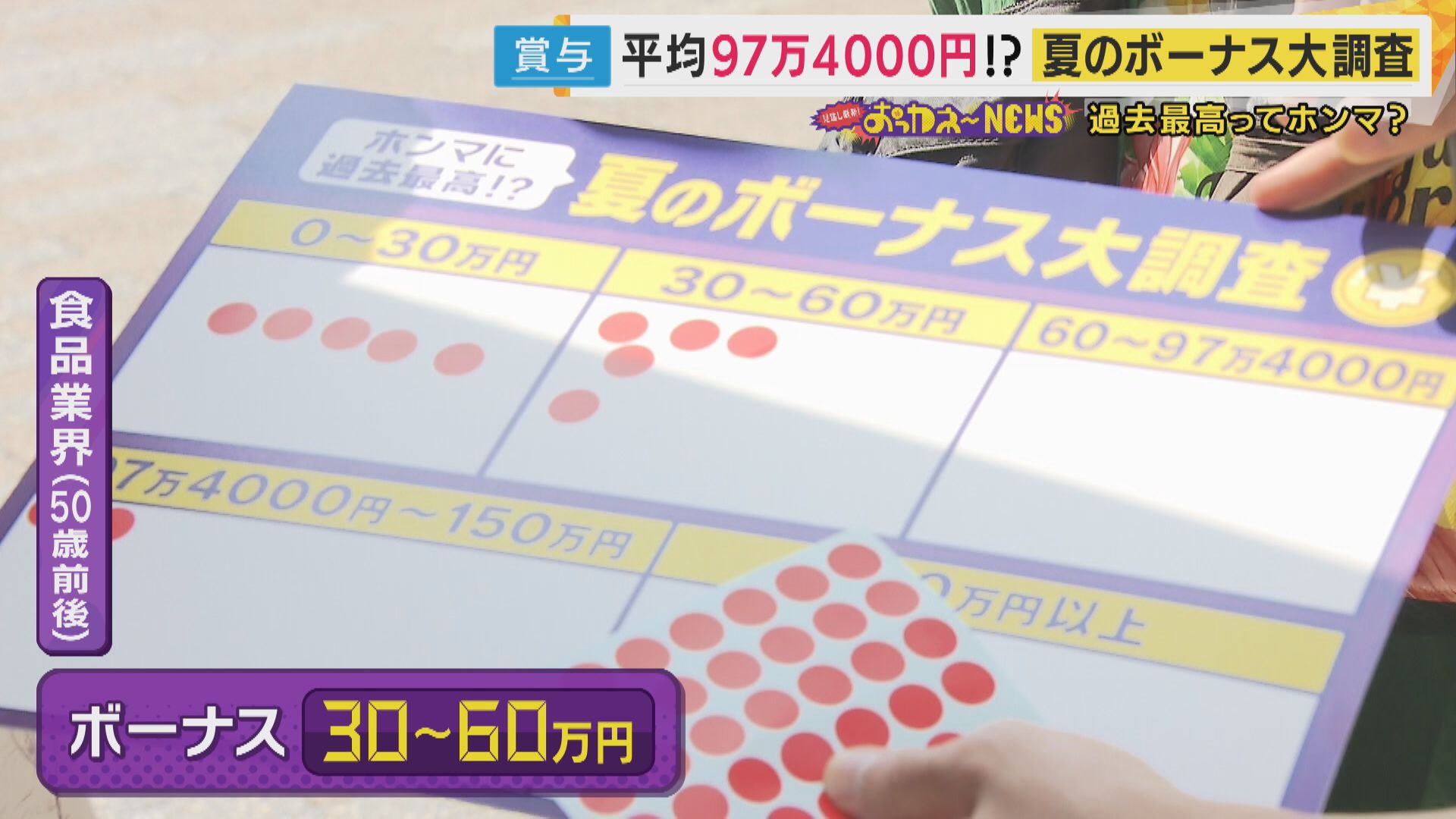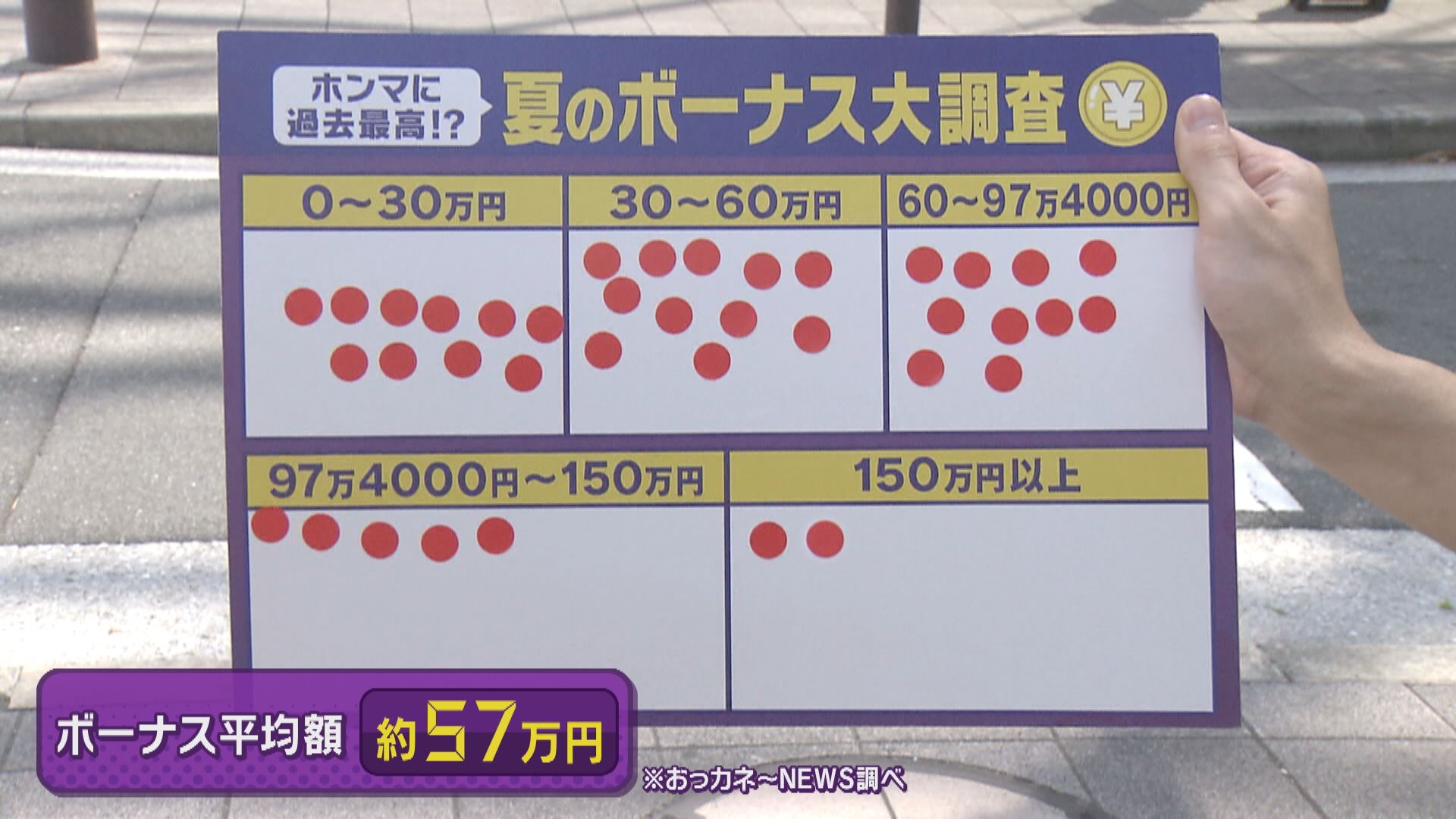 【秦アナウンサー】「今年経団連が出した発表で、ボーナスの平均が97万4000円で過去最高額だったんですよ。実際に街中で話聞いていると、こんな分布になってるんですけど、どう思いますか?」