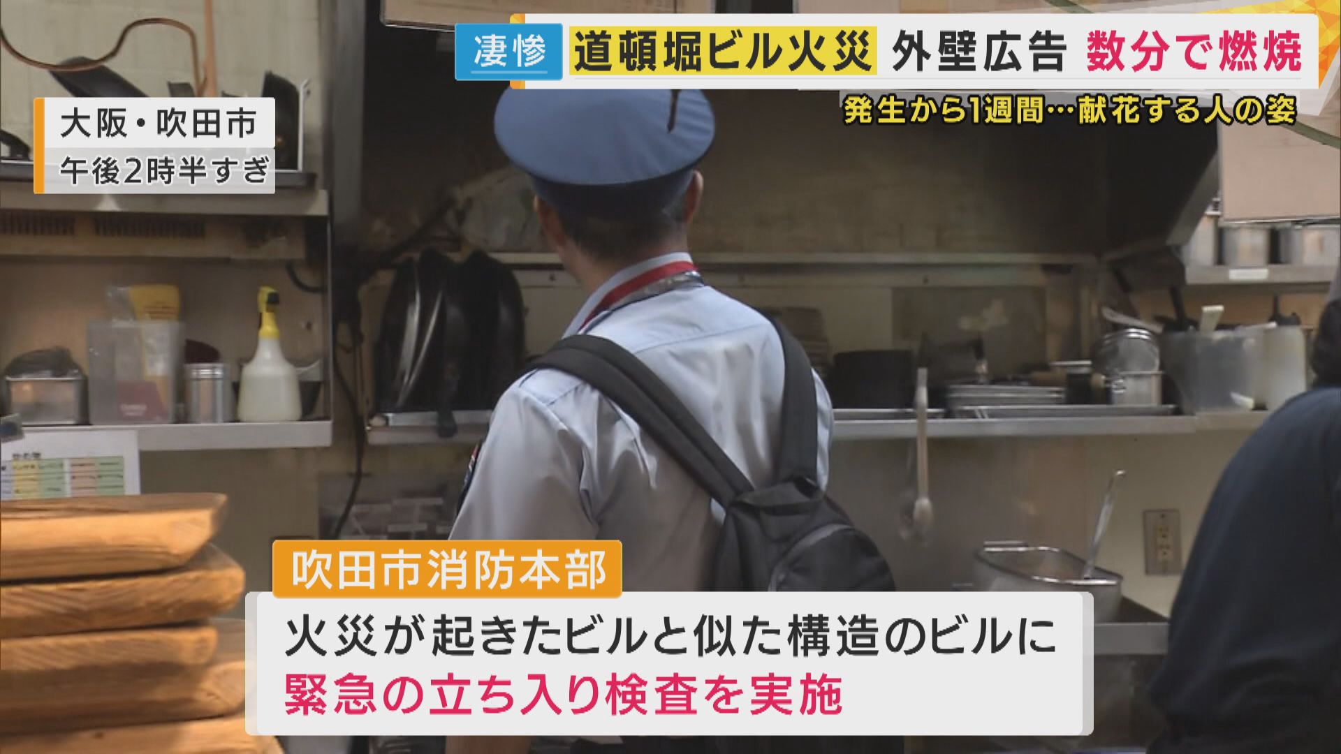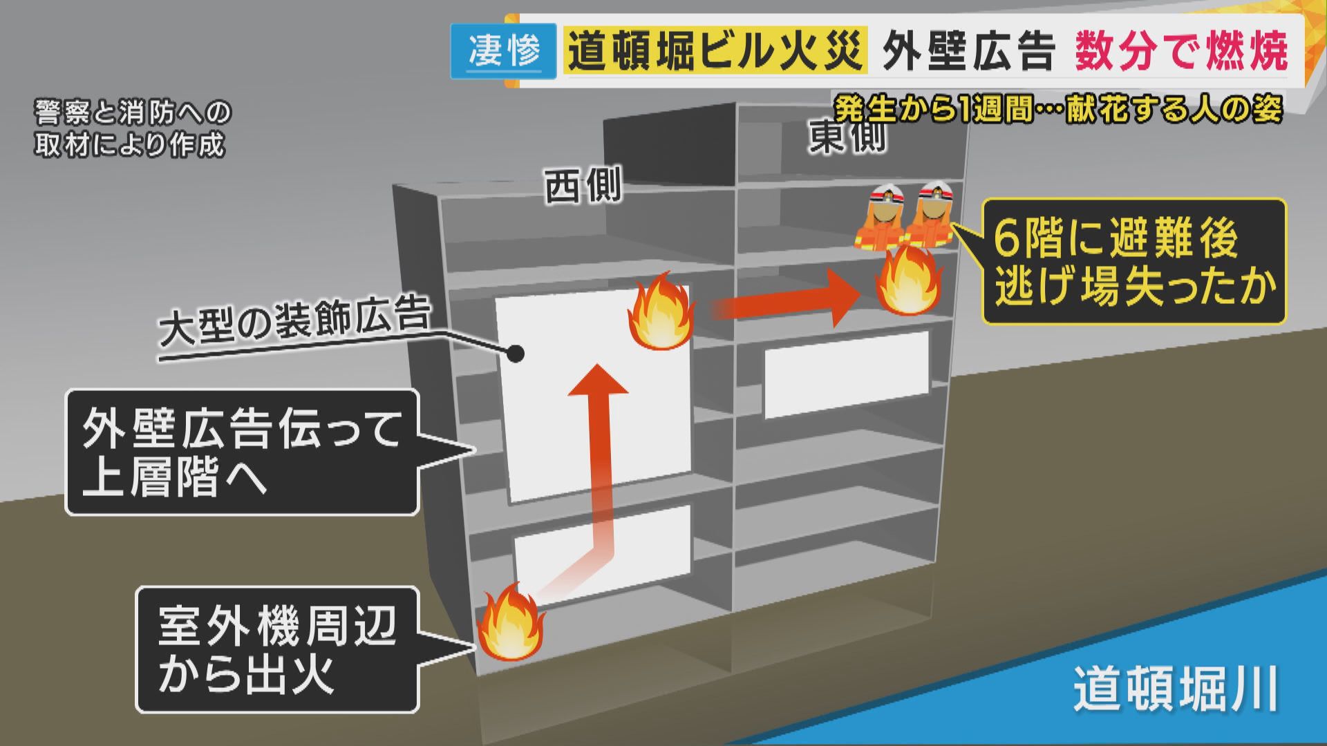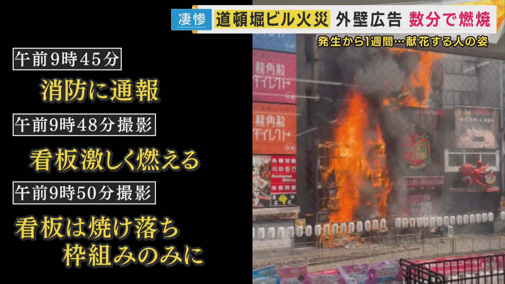 大阪の道頓堀で消防隊員2人が亡くなったビル火災から25日で1週間。外壁の広告が出火から数分で焼け落ちていたことがわかりました。
