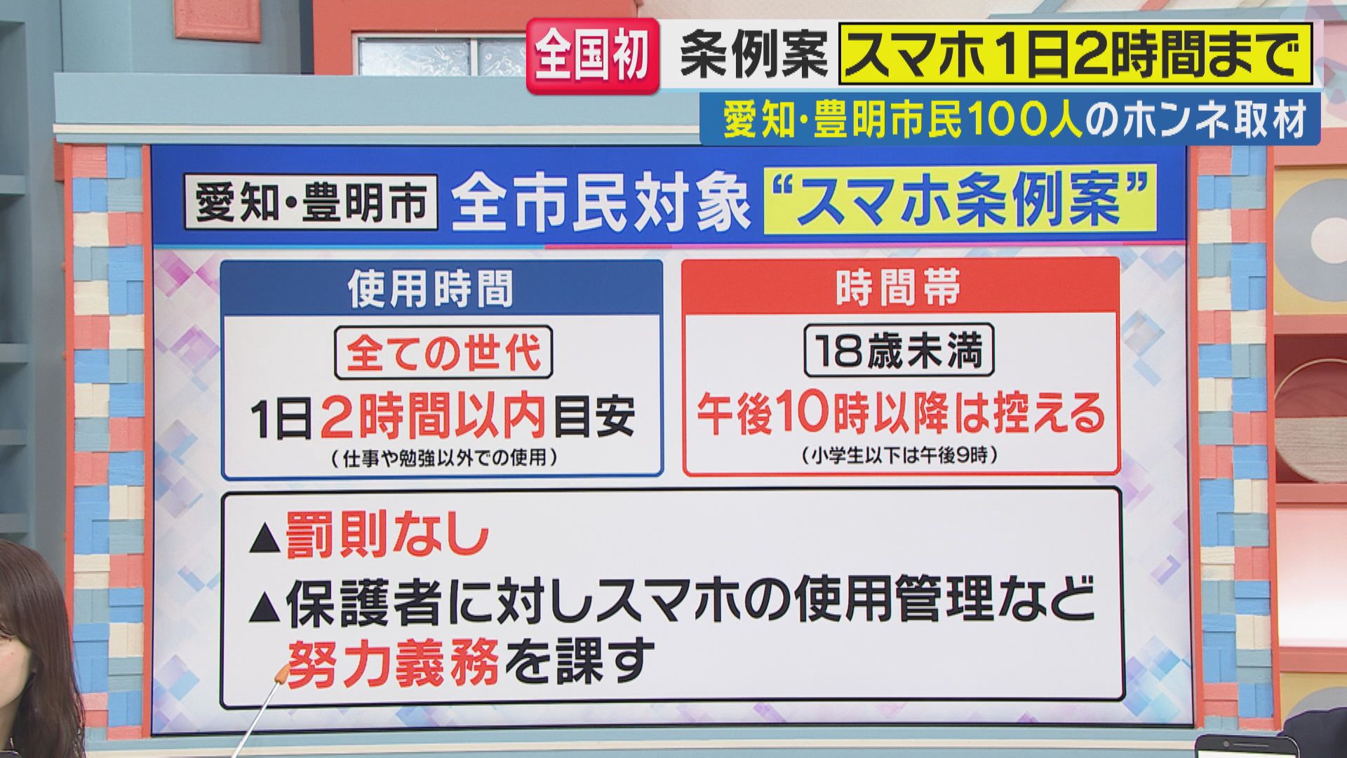 【愛知・豊明市 小浮正典市長】「住民にとっては条例案として、ほかの自治体にないのに、わざわざ豊明市だけが条例案を作ることは。重く受け止められると思う。それだけ重要だと我々は考えている。そういうふうに受け止めてほしい。自分の生活・睡眠時間・食事、いろいろな人とのコミュニケーションに支障がなければ、2時間が3時間~5時間になっても、全然問題はない。あくまで過剰使用を抑えていただきたい。健康にすごしていただきたい。それが自分たちの想いです」