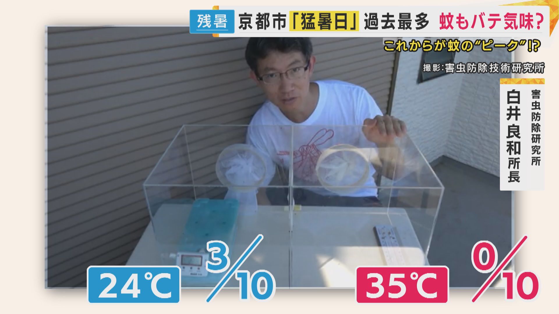 【害虫防除技術研究所・白井良和所長】「暑い(箱の)方の蚊には全く刺されずに、涼しい方の箱では10匹中3匹に刺された」