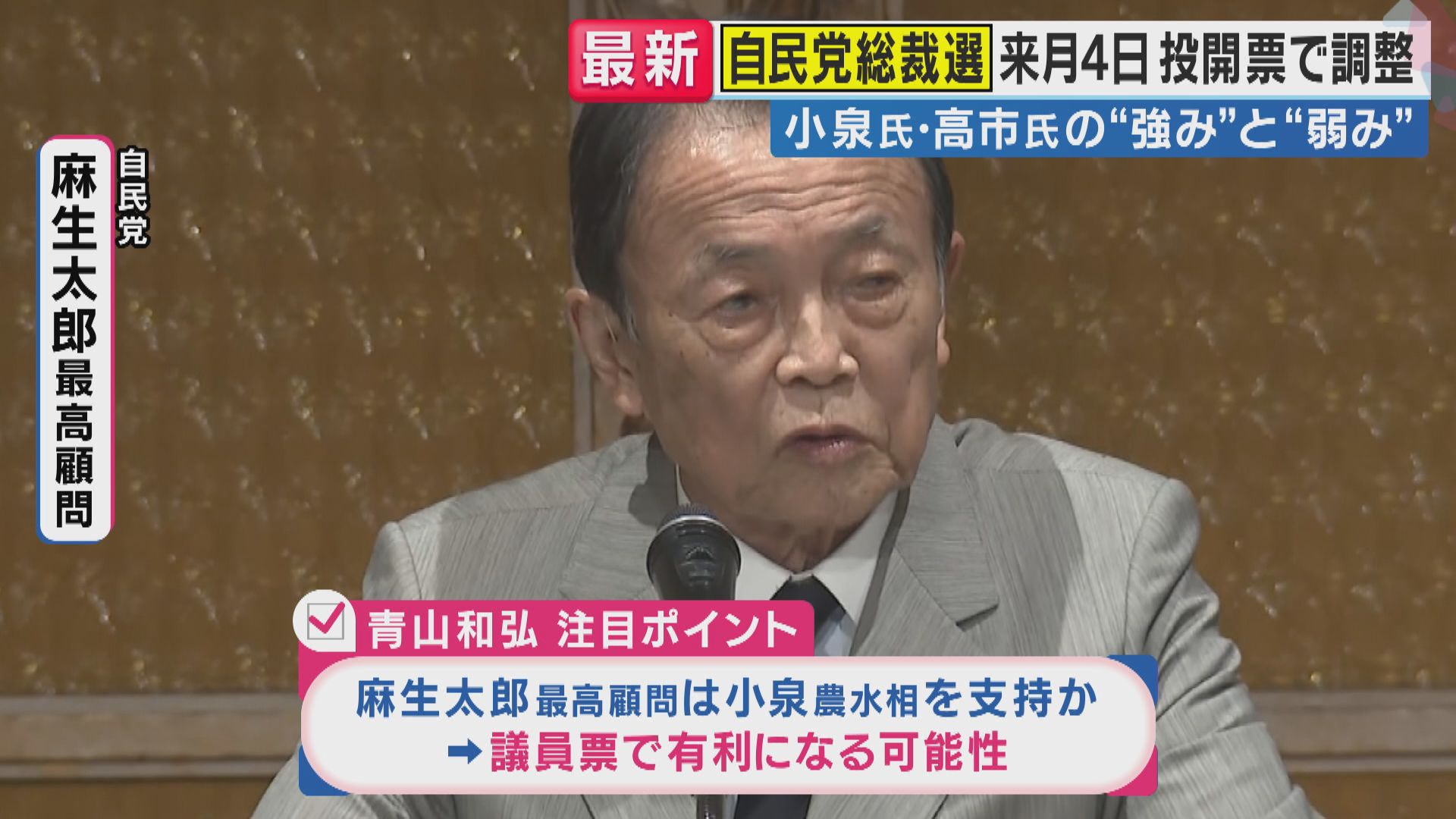 一方で麻生さんは前回、石破・高市の決選投票では、『麻生派はみんな高市に行け』と言って、高市さんに乗った。結局は勝てなかったんですが、そういった考えが今回もあるのかどうかですが、周辺によると、麻生さんは『今回は小泉さんでいいんじゃないか』ということを示唆しているようです。