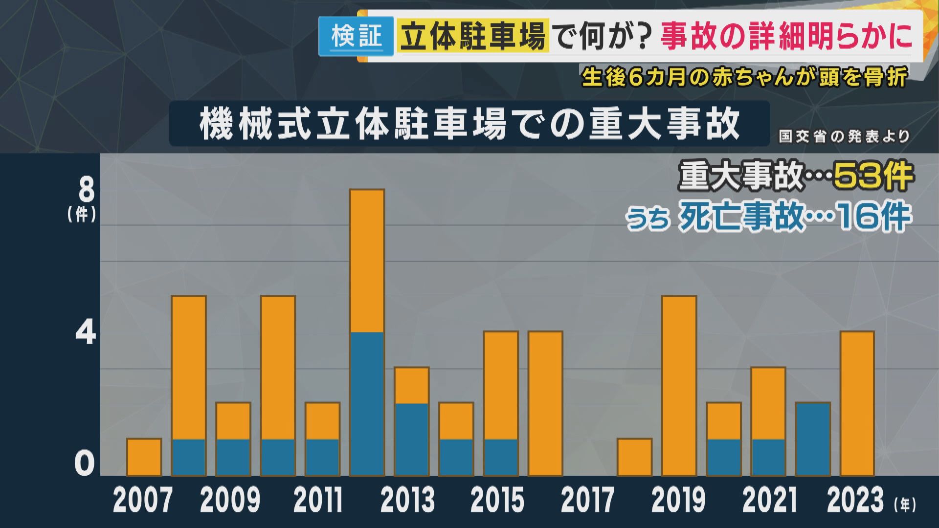国土交通省によると、機械式立体駐車場での重大な事故は、おととしまでの17年間で53件起きていて、そのうち死亡事故は16件となっています。