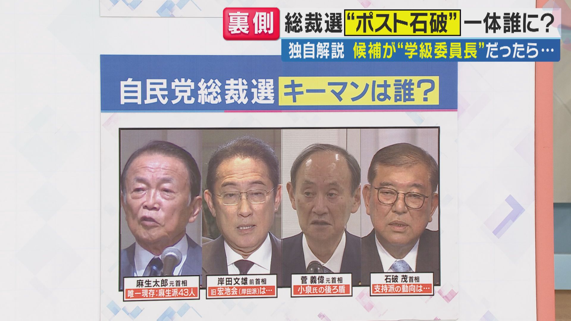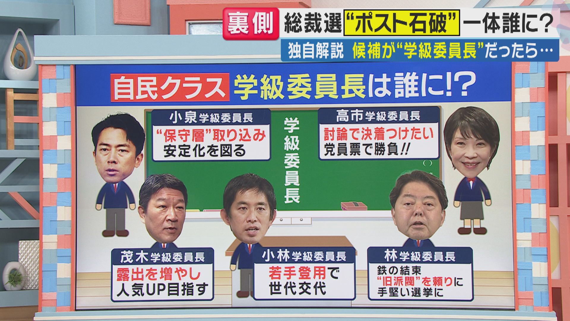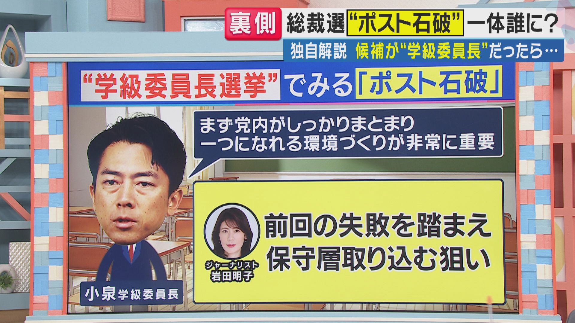 【岩田明子さん】「前回の総裁選では、候補者間の討論をきっかけに失速してしまった面がありましたので、この部分をいかにしてクリアにするのかが、ポイントです。 それから自民党は参議院選挙で大敗していますので、とにかく党内を『まずまとめる』というところを大きく掲げているのも今回の特徴です」