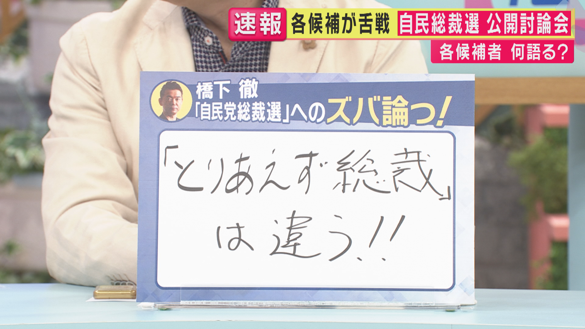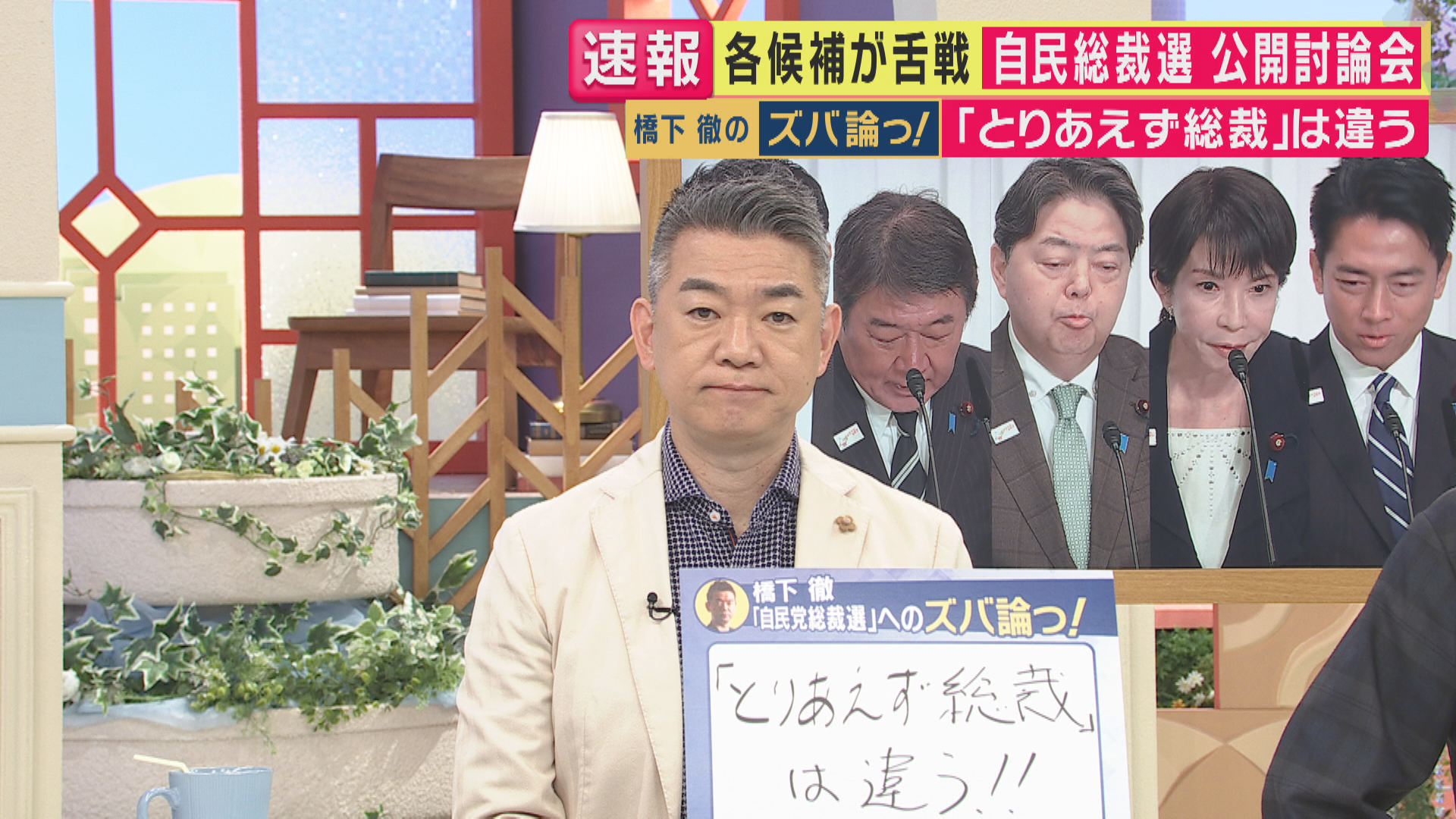 24日、関西テレビの「旬感LIVE とれたてっ!」に出演した橋下徹氏は、候補者が「『とりあえず総裁』というポジションを得て、もめないような政治をやると感じた」と話し、『とりあえず総裁(になるの)は違う』と指摘しました。
