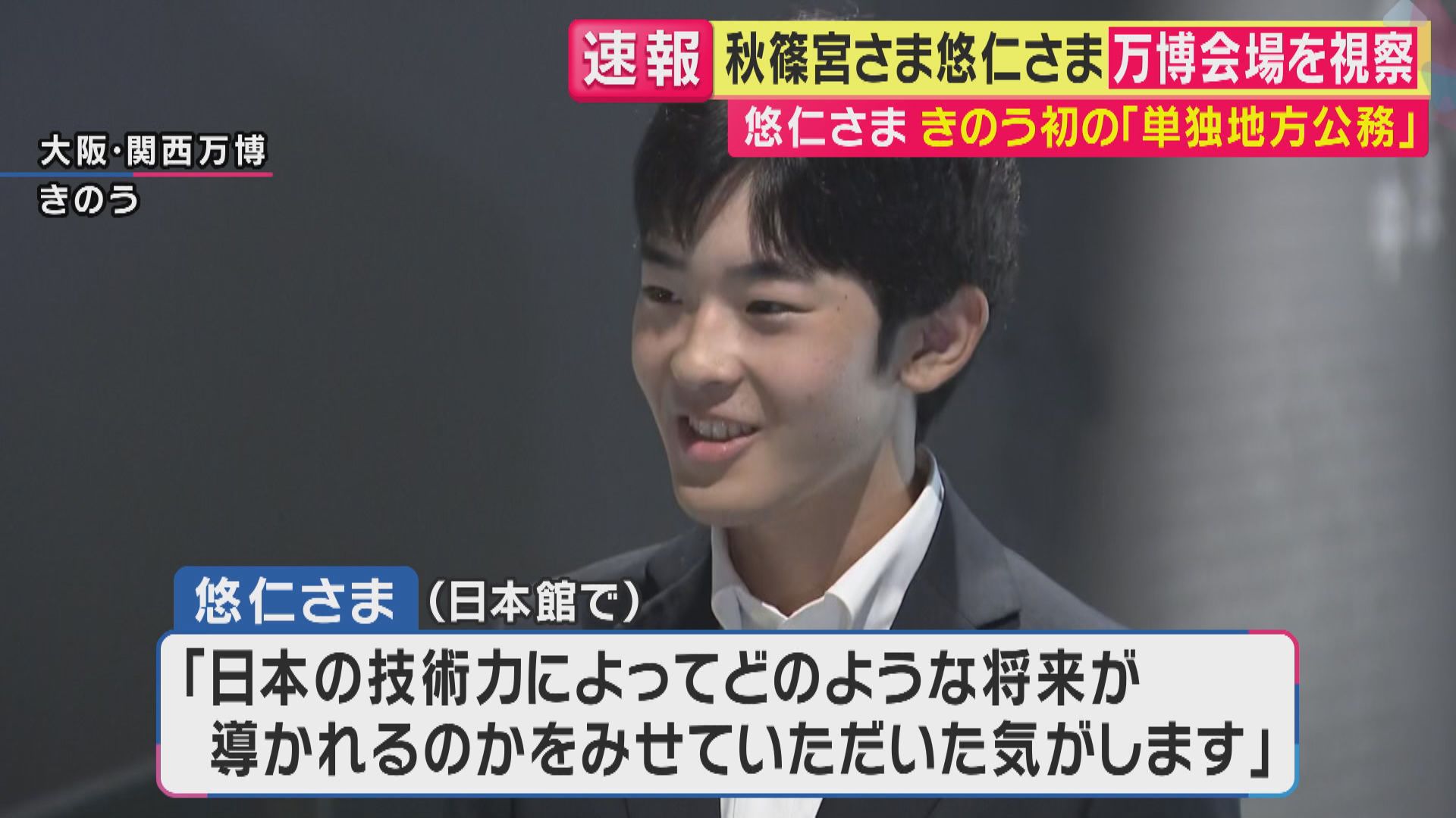 成年式を終えた悠仁さまが、単独で地方公務に臨まれるのは初めてで、25日も引き続き、万博会場を視察されています。