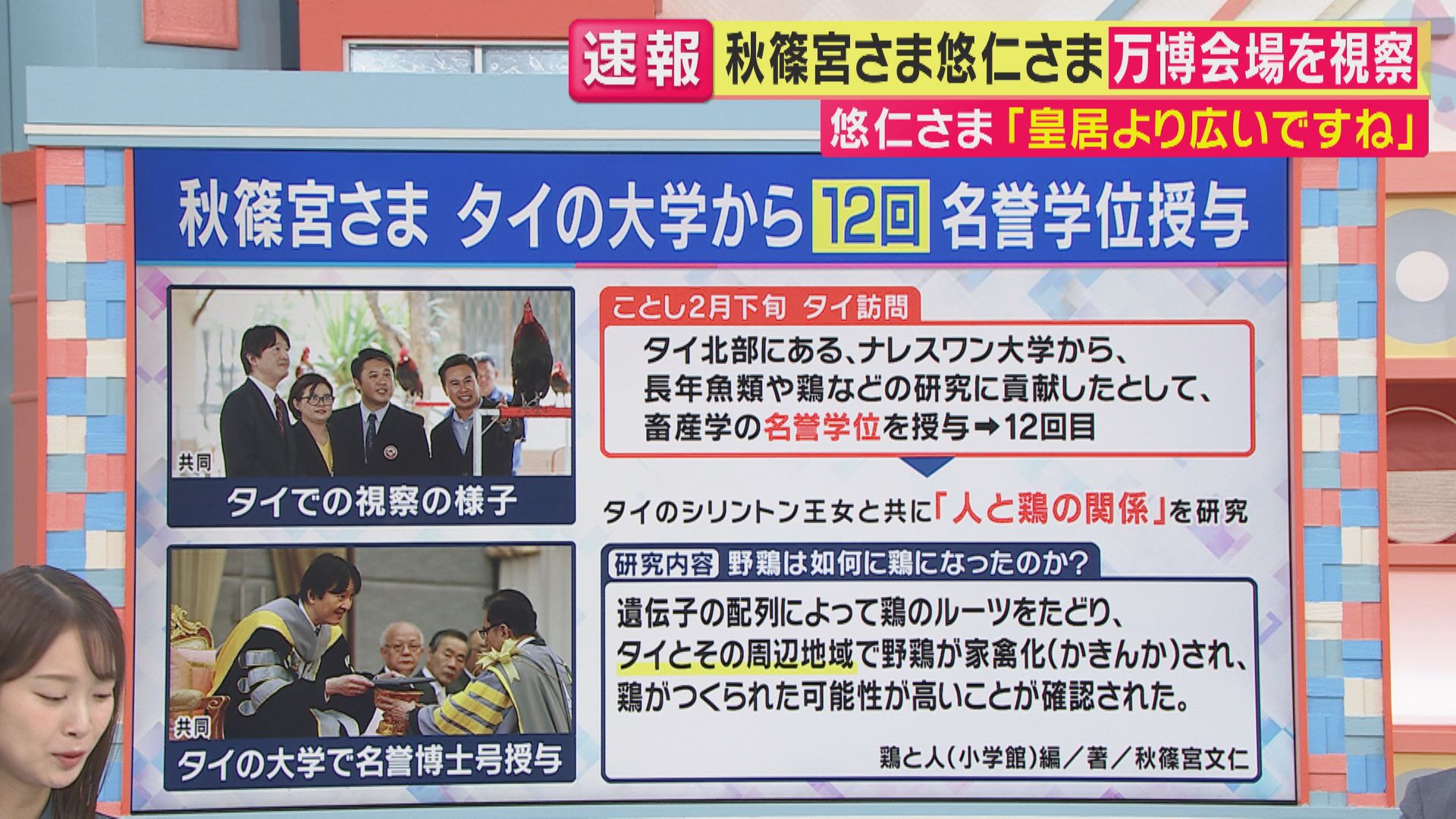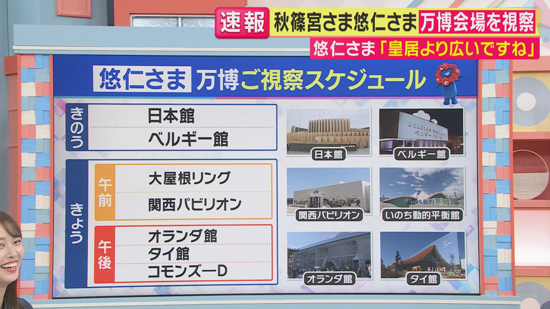 そして大阪に宿泊をされて、きょう=25日午前に「大屋根リング」と、「関西パビリオン」、そして午後に「オランダ館」と、秋篠宮家とつながりのある「タイ館」、さらには「コモンズ‐D館」を視察されて、東京に戻られる予定だということです。