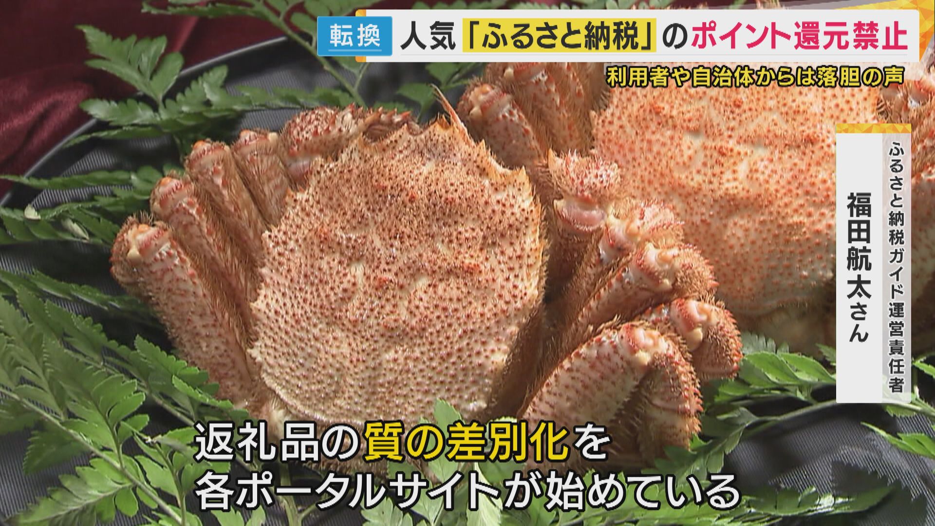 【”ふるさと納税ガイド”を運営 株式会社カリーグズ・福田航太代表】「同じ人気商品の返礼品でも、うちのサイトだけ安いですよとか、同じ返礼品かつ同じ価格でもうちのサイトだけちょっと量が多いですよとか。返礼品の質の差別化っていうのを各ポータルサイトが始めている」