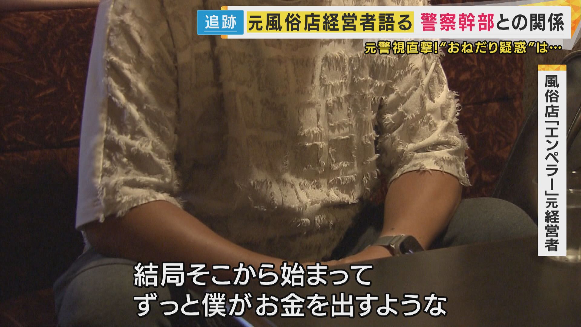 【風俗店「エンペラー」元経営者】「ご飯食べて飲んでいる時に、元警視は『うちの会社(警察)はおたくの業務に対して挙げようと思えば、すぐに挙げられるからね』、『いつでも摘発できるぞ』みたいな言い方をされたんです。『うち(警察)が目つむってるようなもんだからね』って」