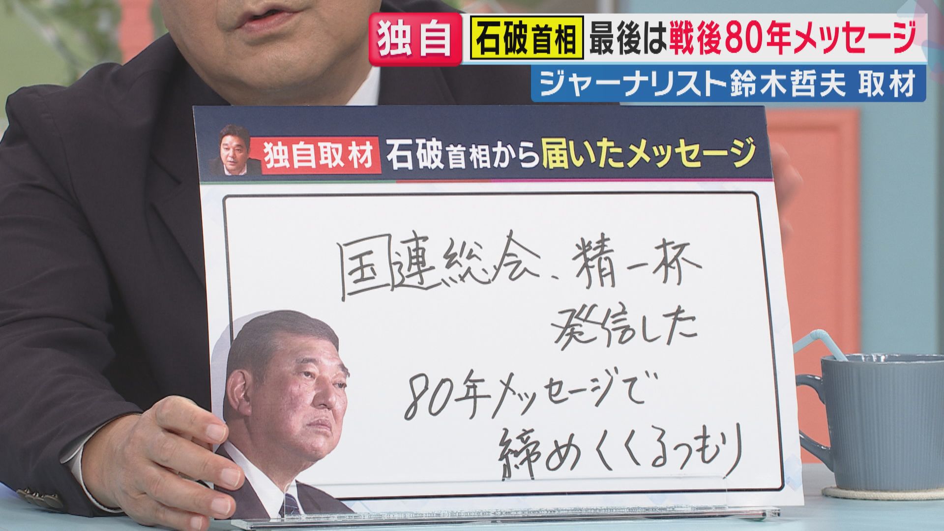 石破総理に連日、直接連絡して取材しているという鈴木さんは、「国連総会から帰ってきた日にちょっとやり取りをした」と明かし、その時のメッセージとして「国連総会、精一杯発進した 80年メッセージで締めくくるつもり」という内容だったと説明しました。