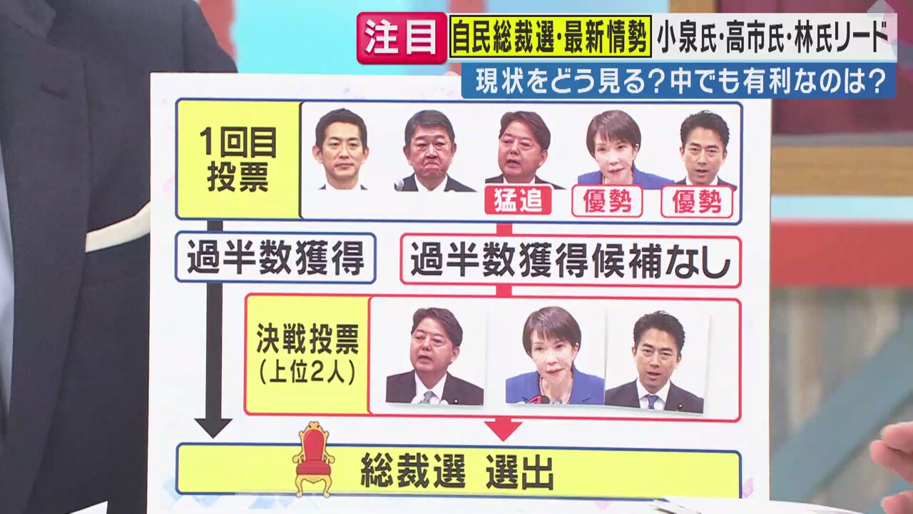 現在の情勢では1回目の投票で過半数を得る候補が出ず、決選投票になる可能性が高いとみられています。決選投票では、小泉氏、林氏、高市氏のうち上位2名になる可能性が高いと予想されます。