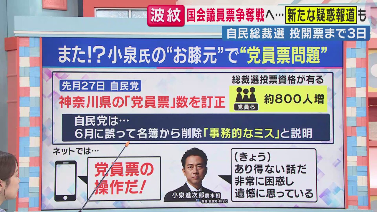 自民党総裁選の投票日が目前に迫る中、小泉進次郎氏が会長を務める神奈川県連の党員票名簿をめぐる問題が波紋を広げています。