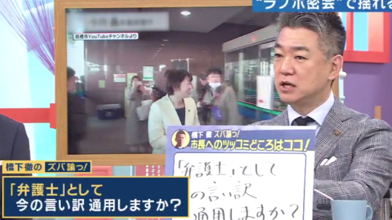 橋下さんは小川市長が男性職員とラブホテルで密会していたことについて、まず、「ラブホテルに10回も行っていたら、裁判で不倫関係と認められる。弁護士資格を持っていればわかるはずで、それを否定するべきではなかった」と主張しました。