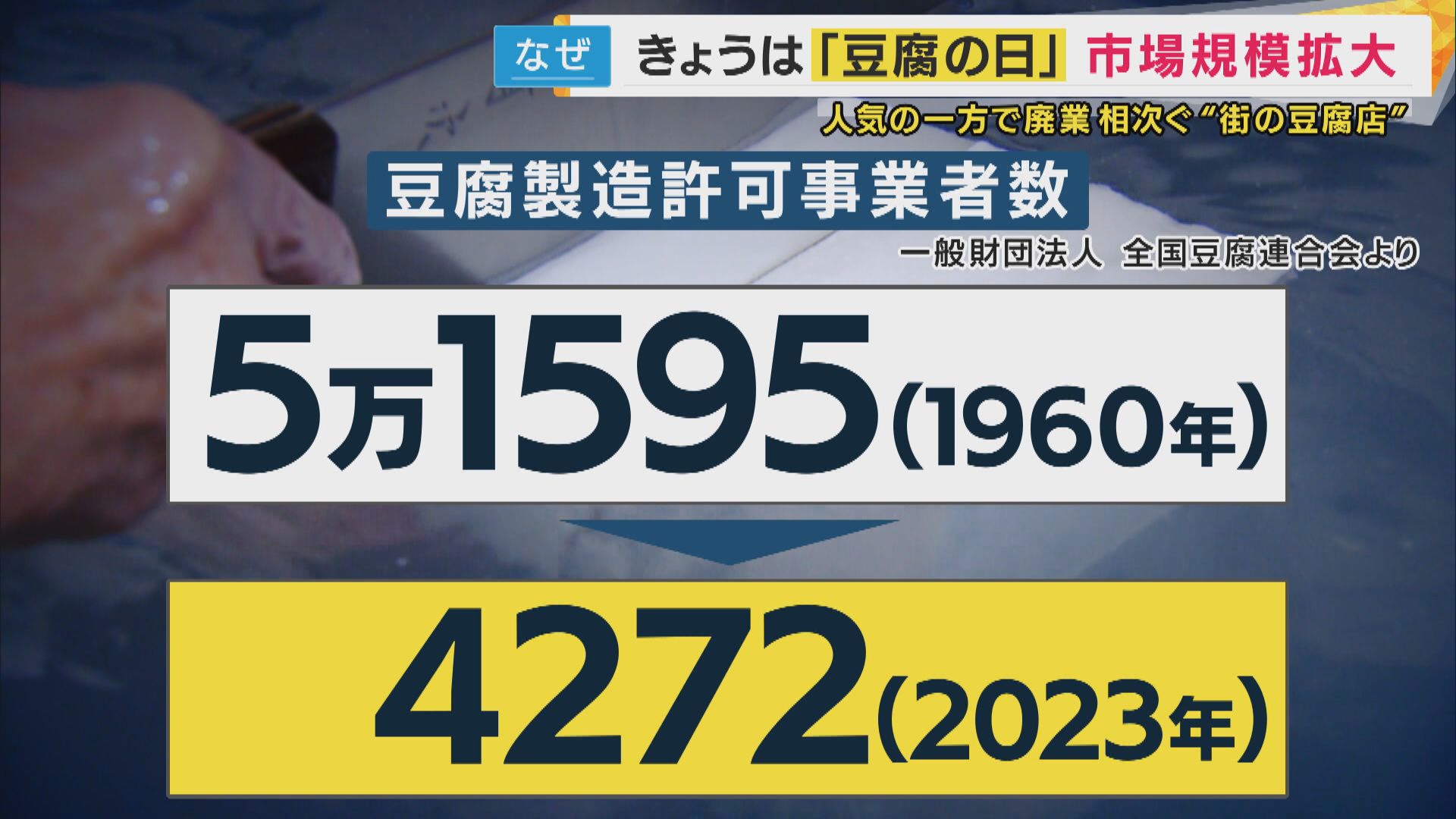 その人気の一方で、日本では、昔よく見かけた「街の豆腐店」が減少しています。一体、豆腐業界で何が起きているのでしょうか。