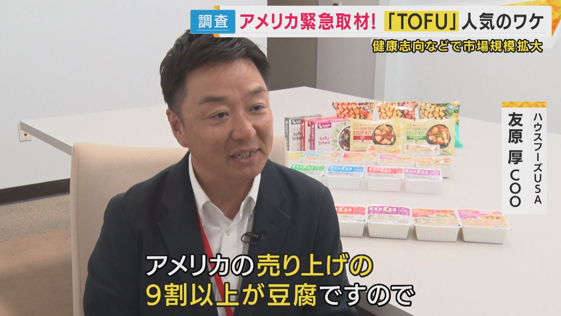 【ハウスフーズUSA友原厚COO】「1983年に現地で豆腐事業をされていた会社と一緒に手をとって豆腐事業に参画させていただいたのが始まり。(アメリカでは)われわれは圧倒的に豆腐事業の方が大きいです。アメリカの売り上げの9割以上が豆腐です」