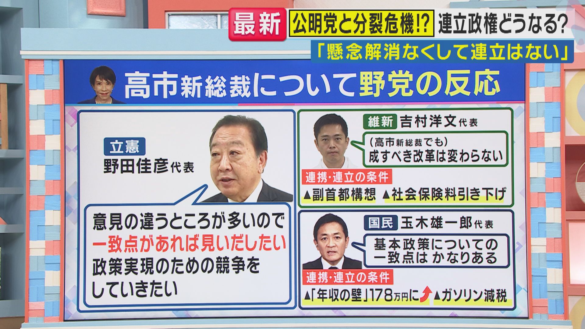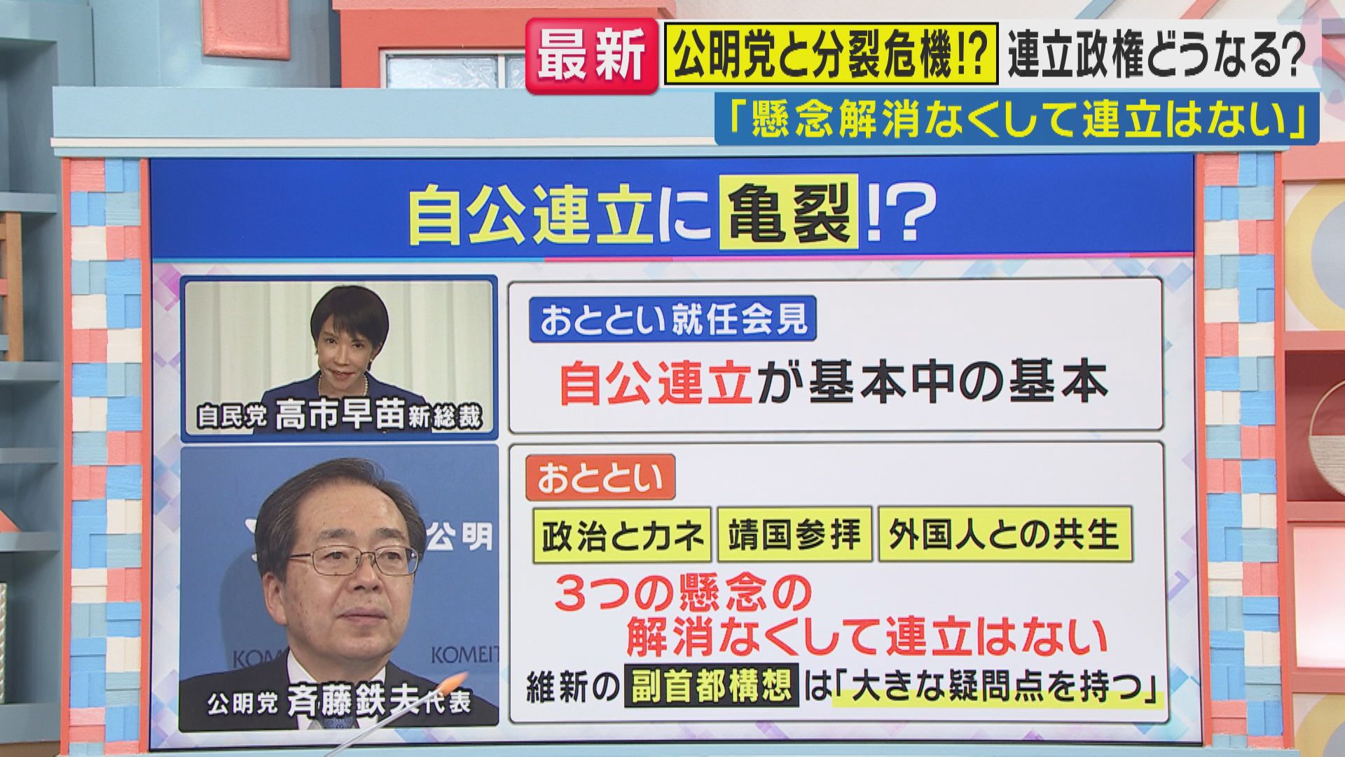 一方の公明党・斉藤代表は「『政治とカネ』『靖国参拝』『外国人との共生』これら3つの懸念の解消をなくして連立はない」と、連立からの離脱をほのめかして牽制しているという状況です。