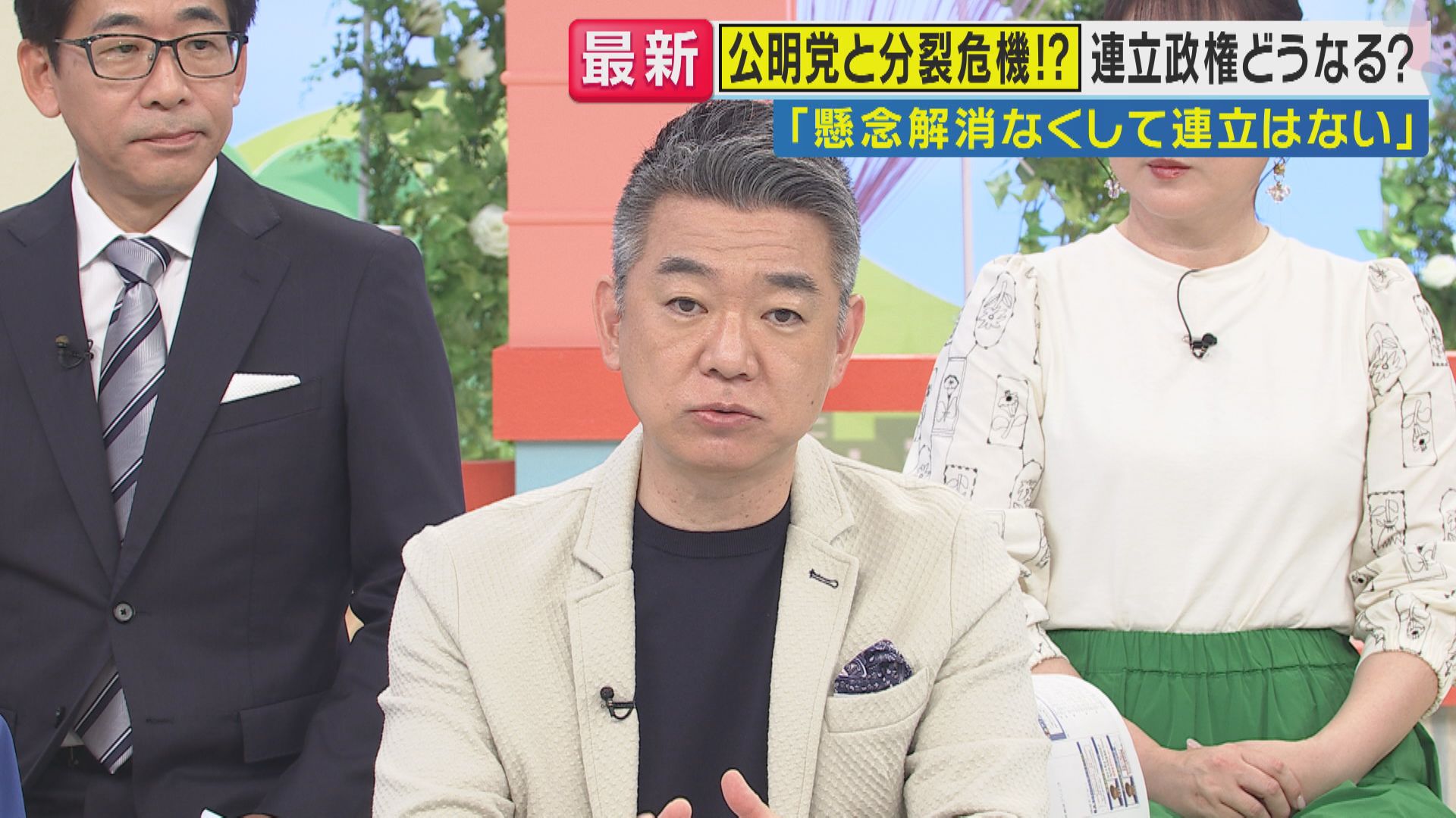 関西テレビ「旬感LIVE とれたてっ!」に出演した橋下徹さんは、自民党と公明党の「政策合意書にこうした公明党の考えが記載されるかどうかで本気かどうかわかる」としつつ、「今は少数与党なので、『何があっても自民党についていく』というのは、公明党にかえってマイナスになる。“公明党らしさ”を出してきている」と指摘しました。