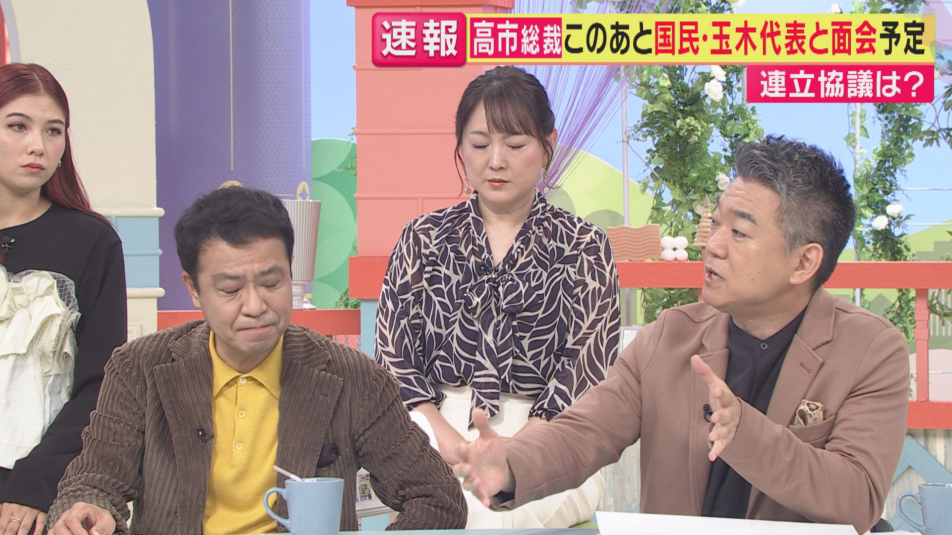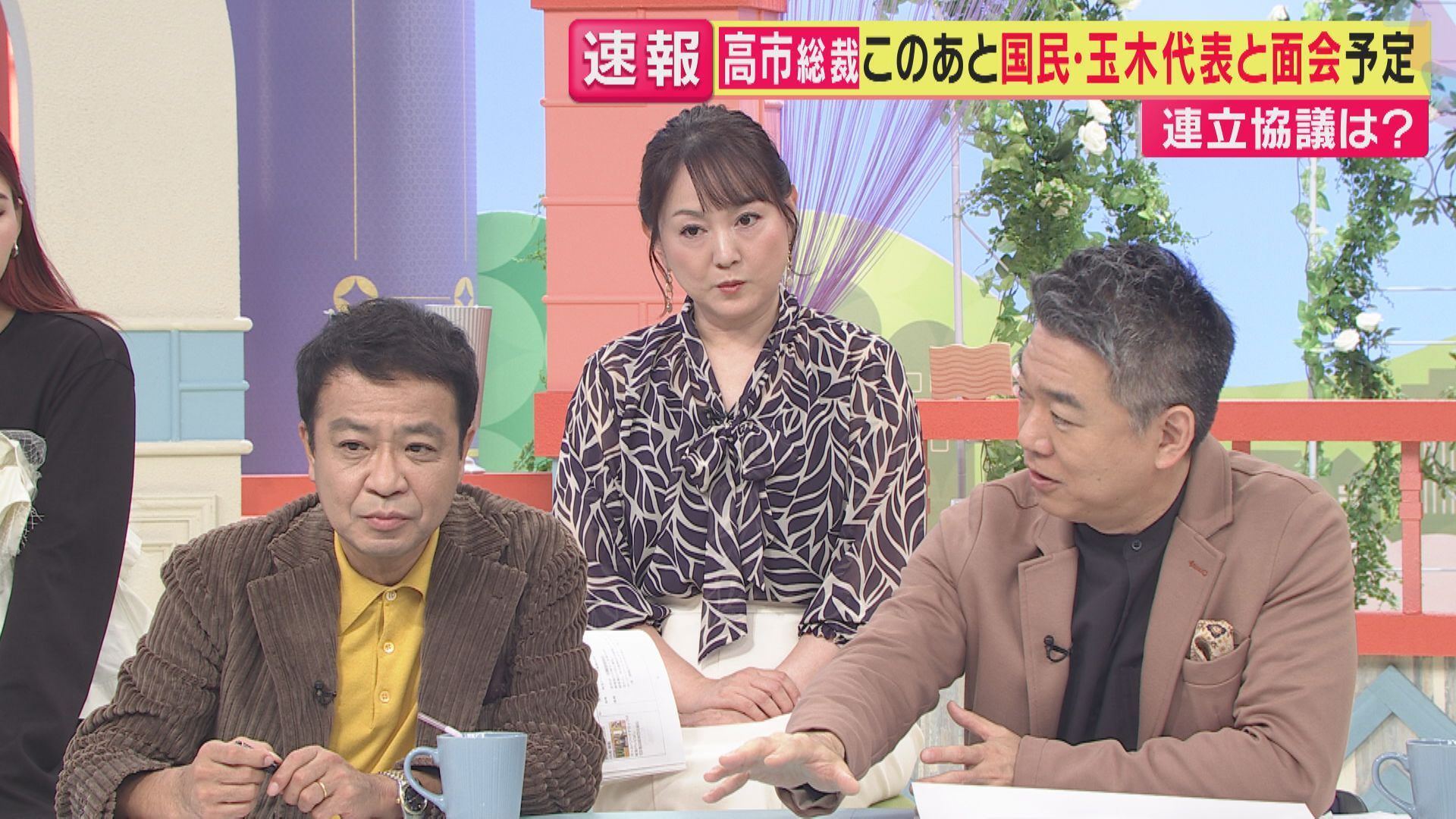 【橋下徹さん】「聞いているところでは、連立の話も一応出ているらしいんですが、玉木さんとしては慎重に、まずはこの2つ、『ガソリン税』の話と『178万円への“年収の壁”の引き上げ』を秋に成立させて、これが実行できたら、『次は連立』って」