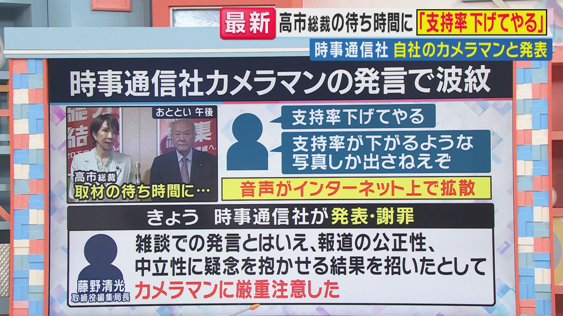 カメラマンが所属する時事通信社の発表によると、カメラマンは他のマスコミとともに、撮影のため高市総裁を待っていた時間に、雑談の中で「支持率下げてやる」「支持率が下がるような写真しか出さねえぞ」という発言をしました。