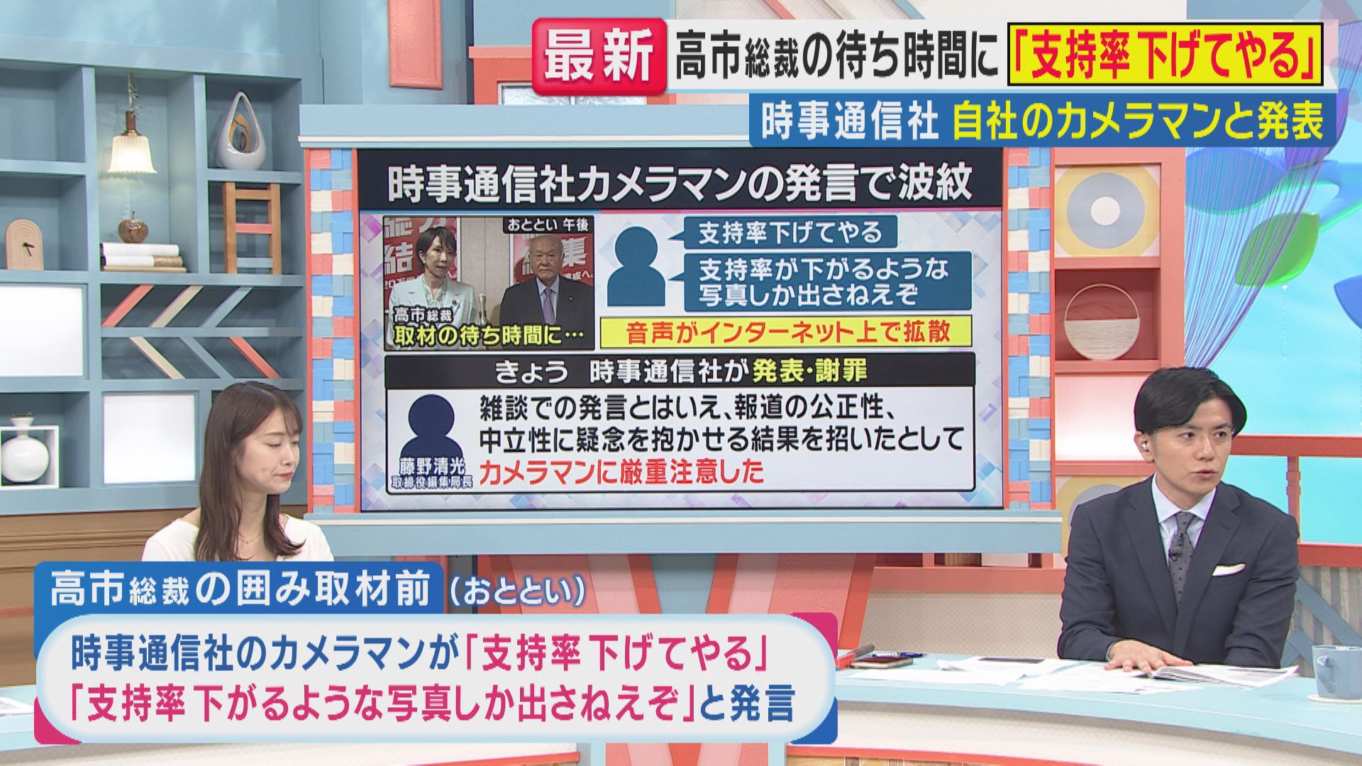 【青木源太キャスター】「時事通信社は『雑談での発言』としていますけれども、例えば『世論を動かせる』とか、『支持率を下げさせることができる』ともしも思っているとしたら、大変な思い違いでもあると思います。