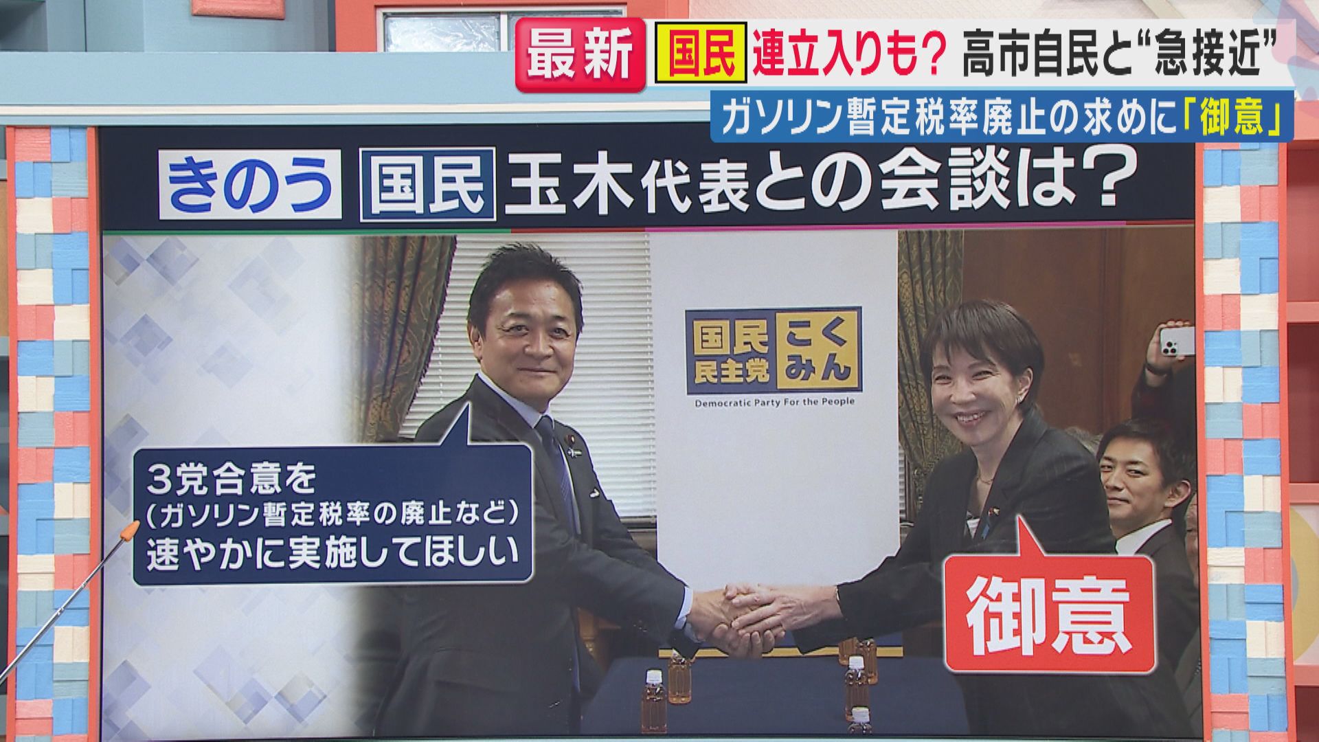 8日、高市総裁と玉木代表は会談し、その際、玉木代表がこれまで国民民主党が主張してきた「ガソリン暫定税率の廃止など、3党合意を速やかに実施して欲しい」と呼びかけたところ、高市総裁は「御意」と答えたということです。