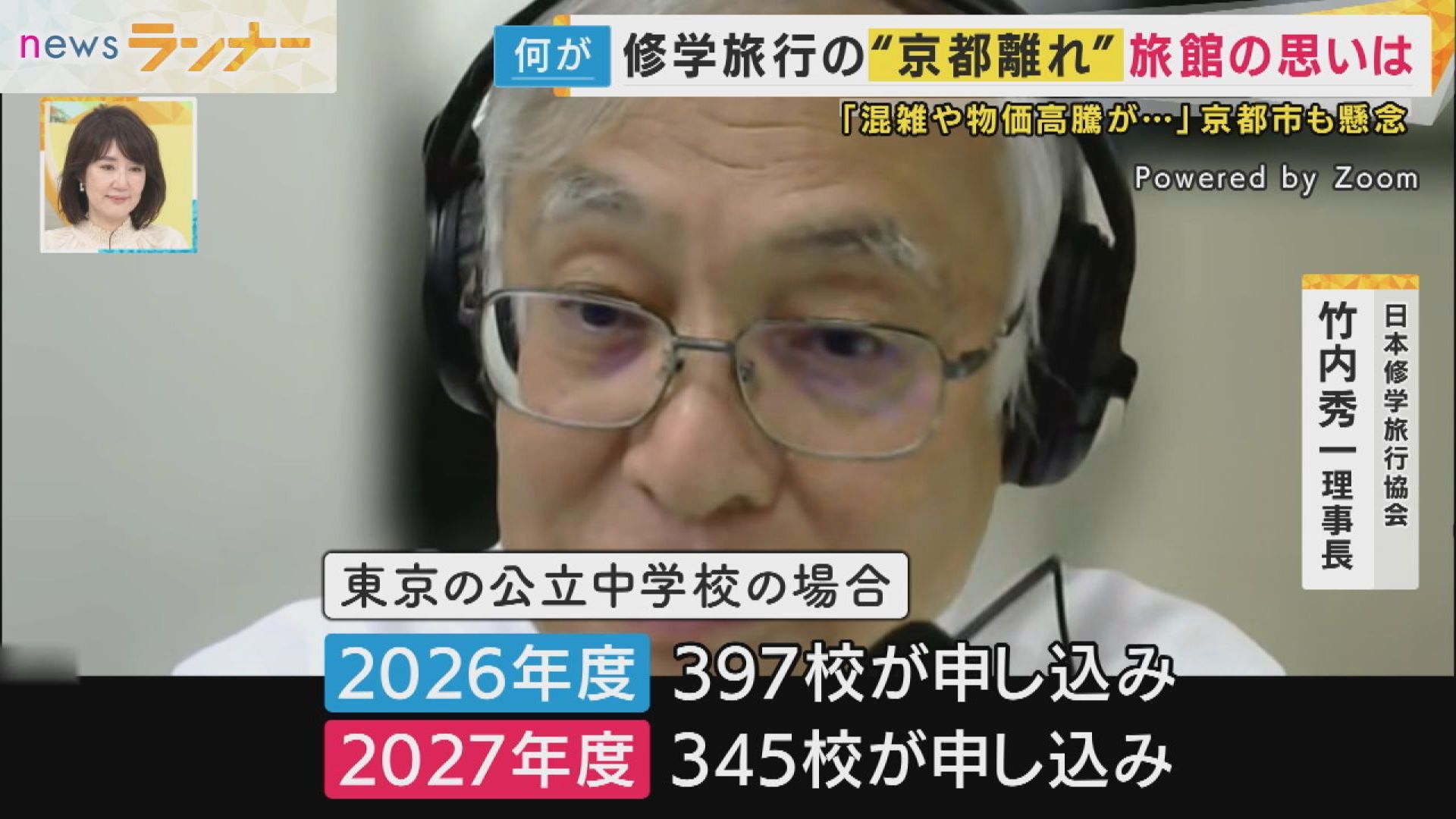 【日本修学旅行協会 竹内秀一理事長】「2026年度関西(の申し込み)が397校あったんです。それが2027年度、(申し込みが)345に減ってるんですよ。トータルだと52校減ってるんですよね」(※全て東京の公立中学校のデータ)