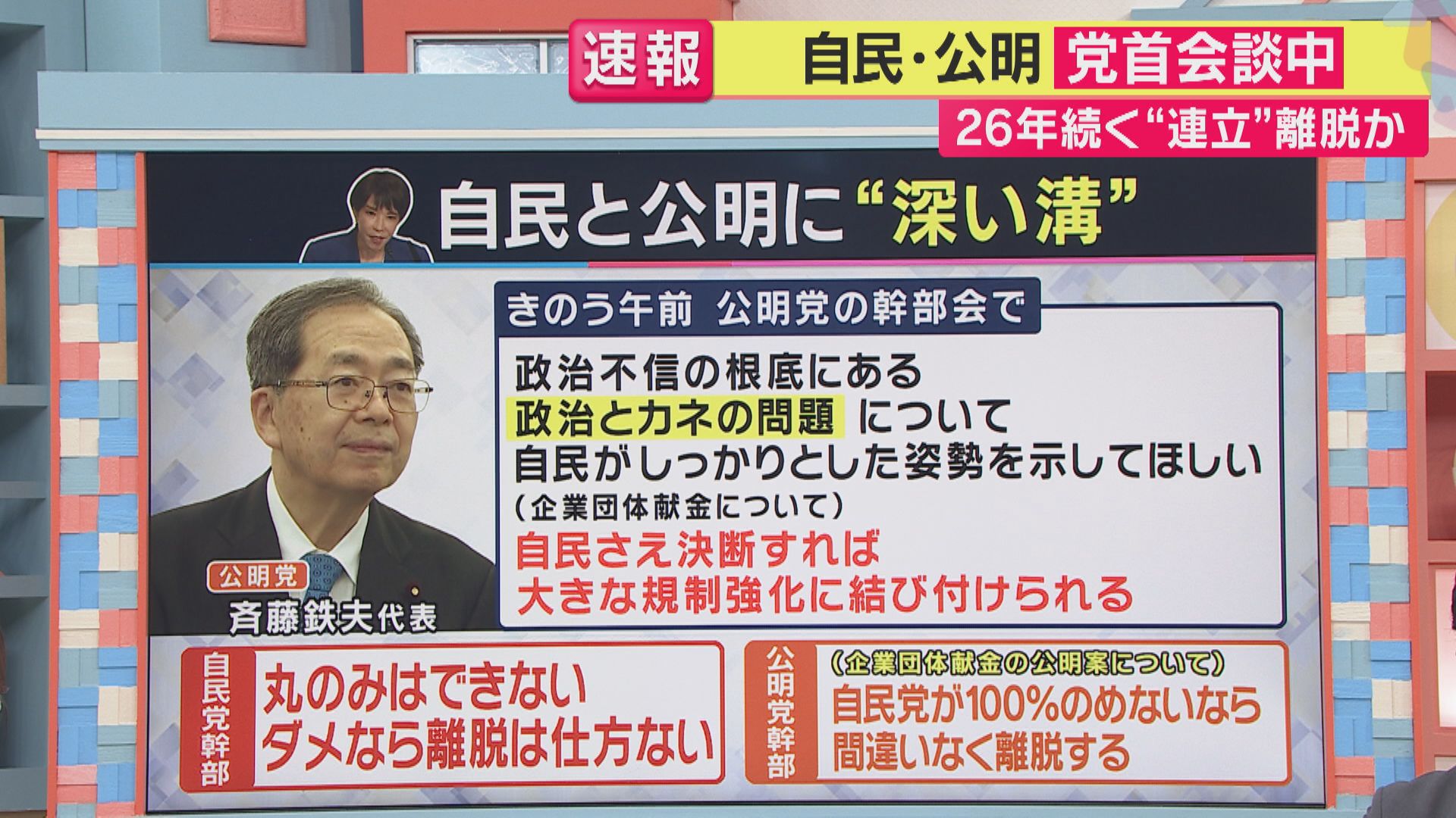 【青木源太キャスター】「一方で、これまで1999年から26年の長期にわたって連立政権を組んできた公明党が、ここまで態度を硬化させているその背景というのは何なんでしょうか」