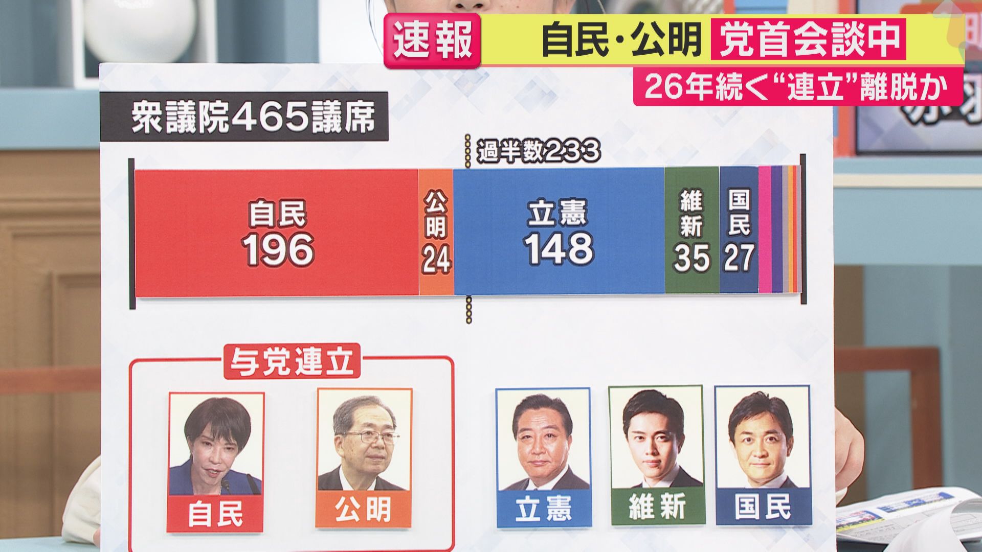 【青木源太キャスター】「議席数を見てみると、自公でも過半数には達していないという中で、自民と公明が分かれるということになれば、本当に野党の動きも含めて、政局混沌としてきますよね」