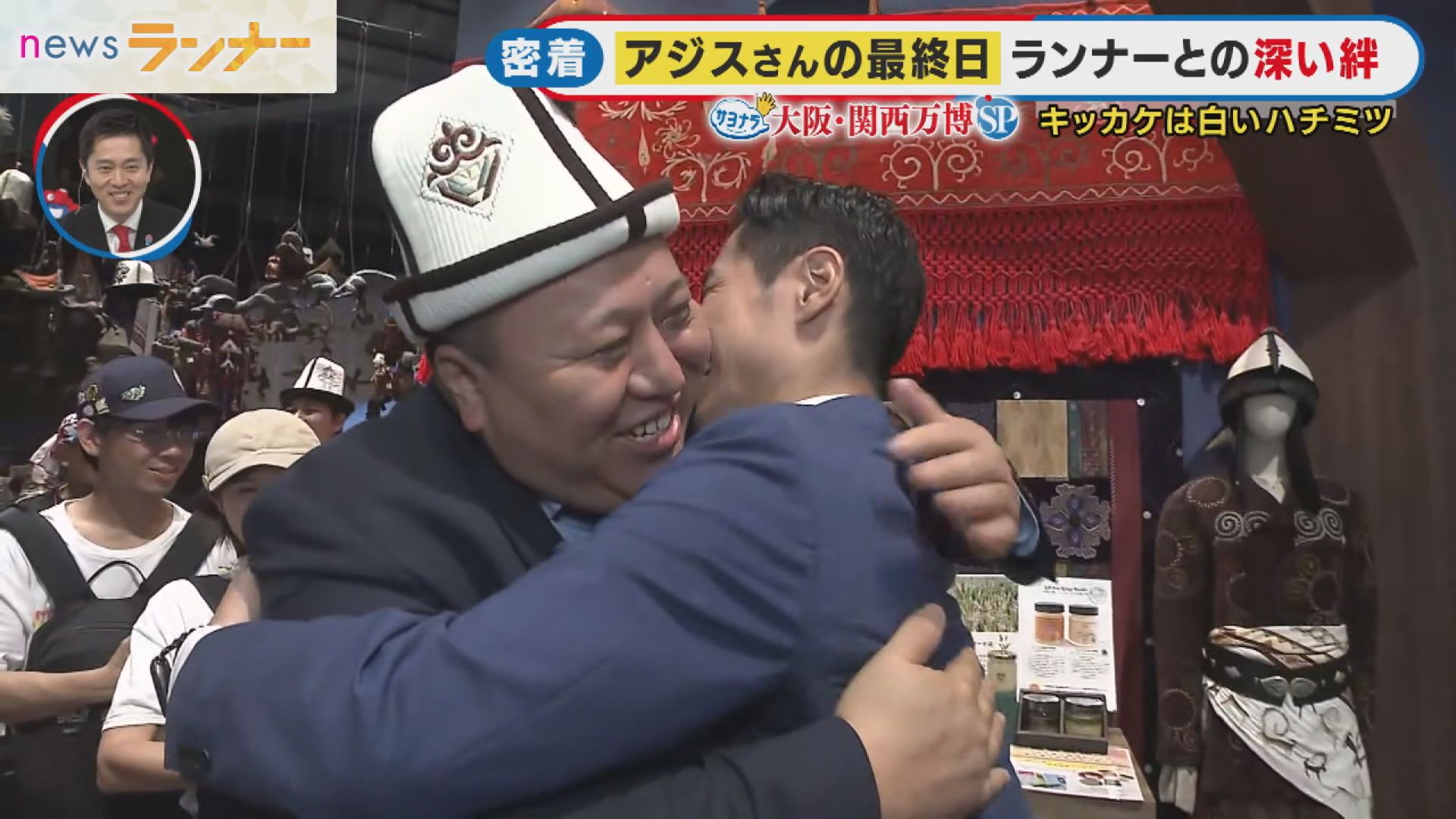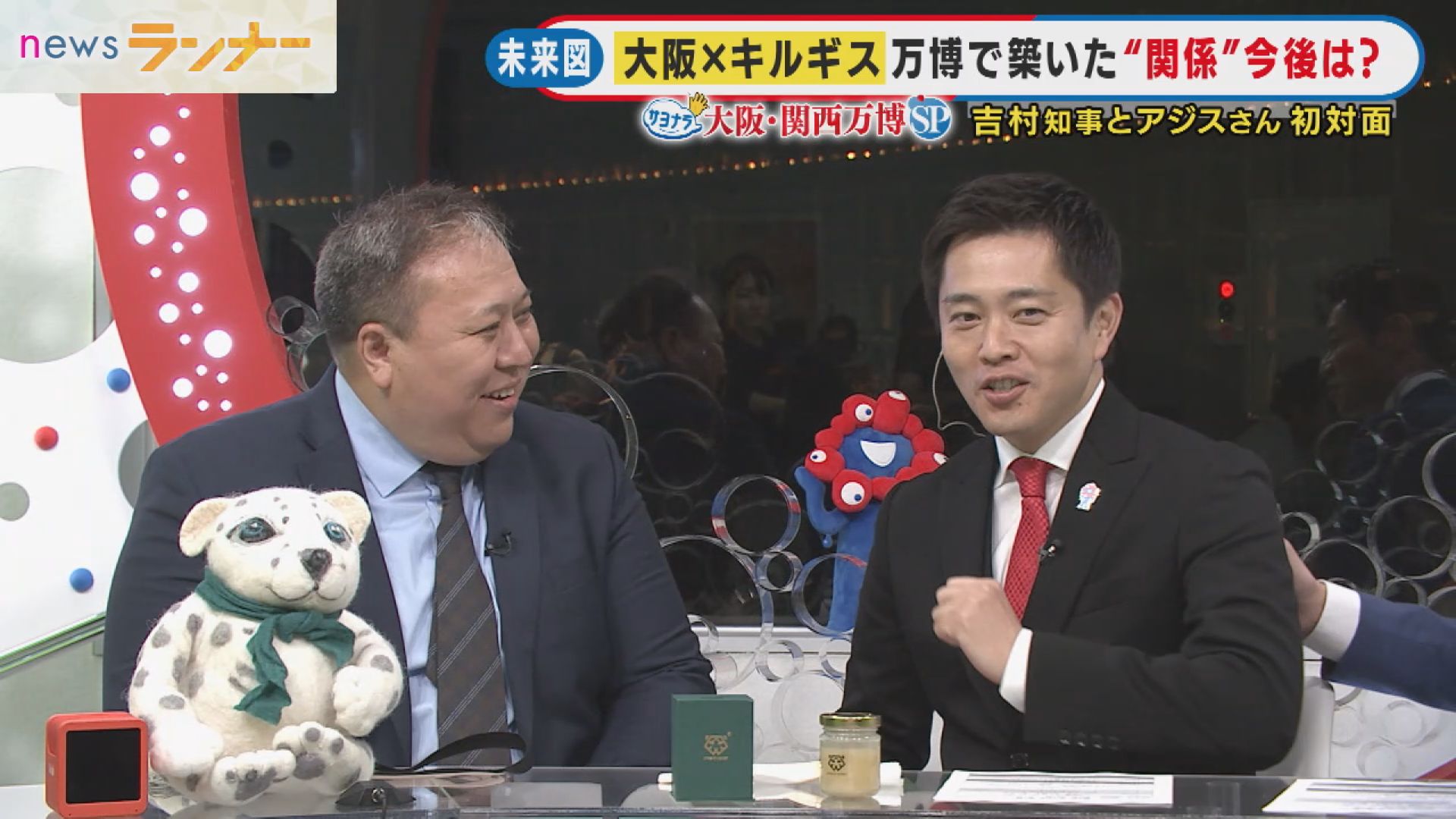 そして最終日の13日、万博会場にあるサテライトスタジオからアジスさんは「newsランナー」に出演。同じく出演していた大阪府の吉村知事に会い、はちみつをプレゼントしました。