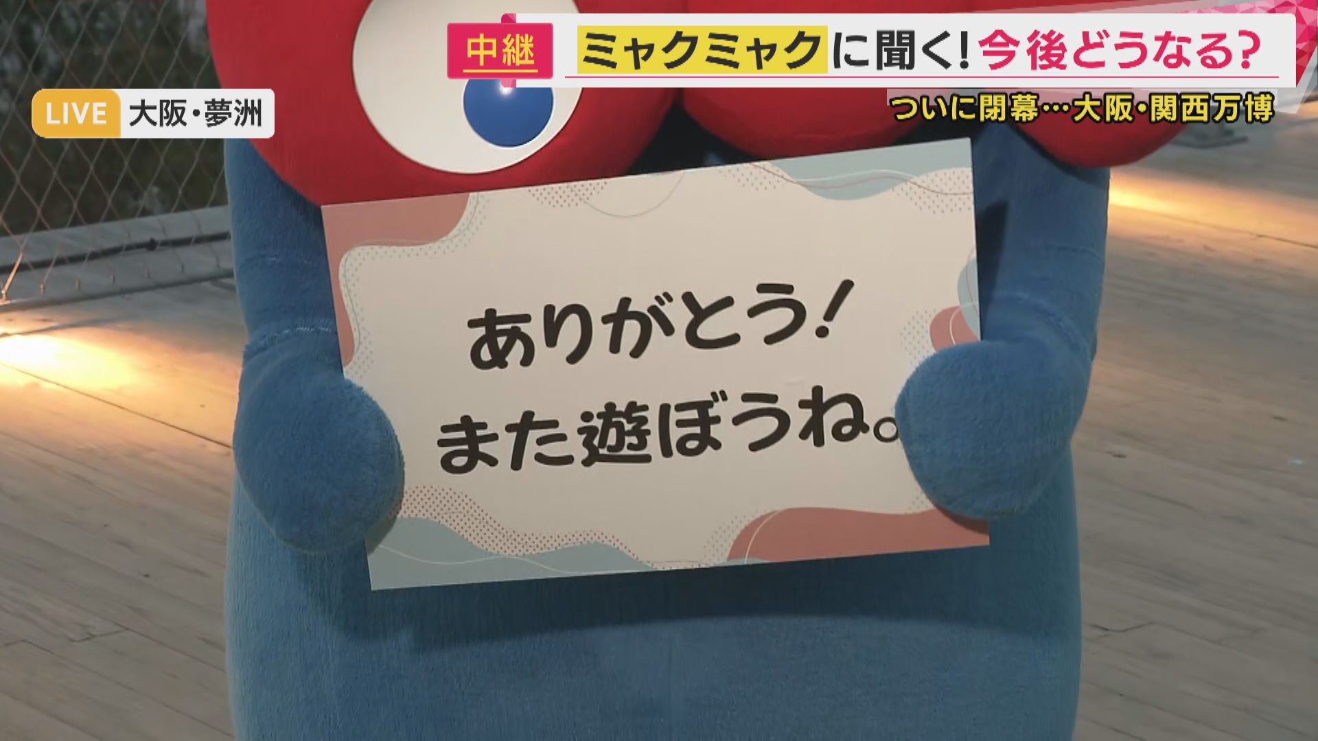 【竹上キャスター】「会場内のショップはきのう=13日で閉店しましたが、大阪の百貨店などにあるオフィシャルストアは閉幕後もしばらく営業が続きます。なんとミャクミャクがオフィシャルストアの応援に行くこともあるということなのでHPなどでご確認ください」