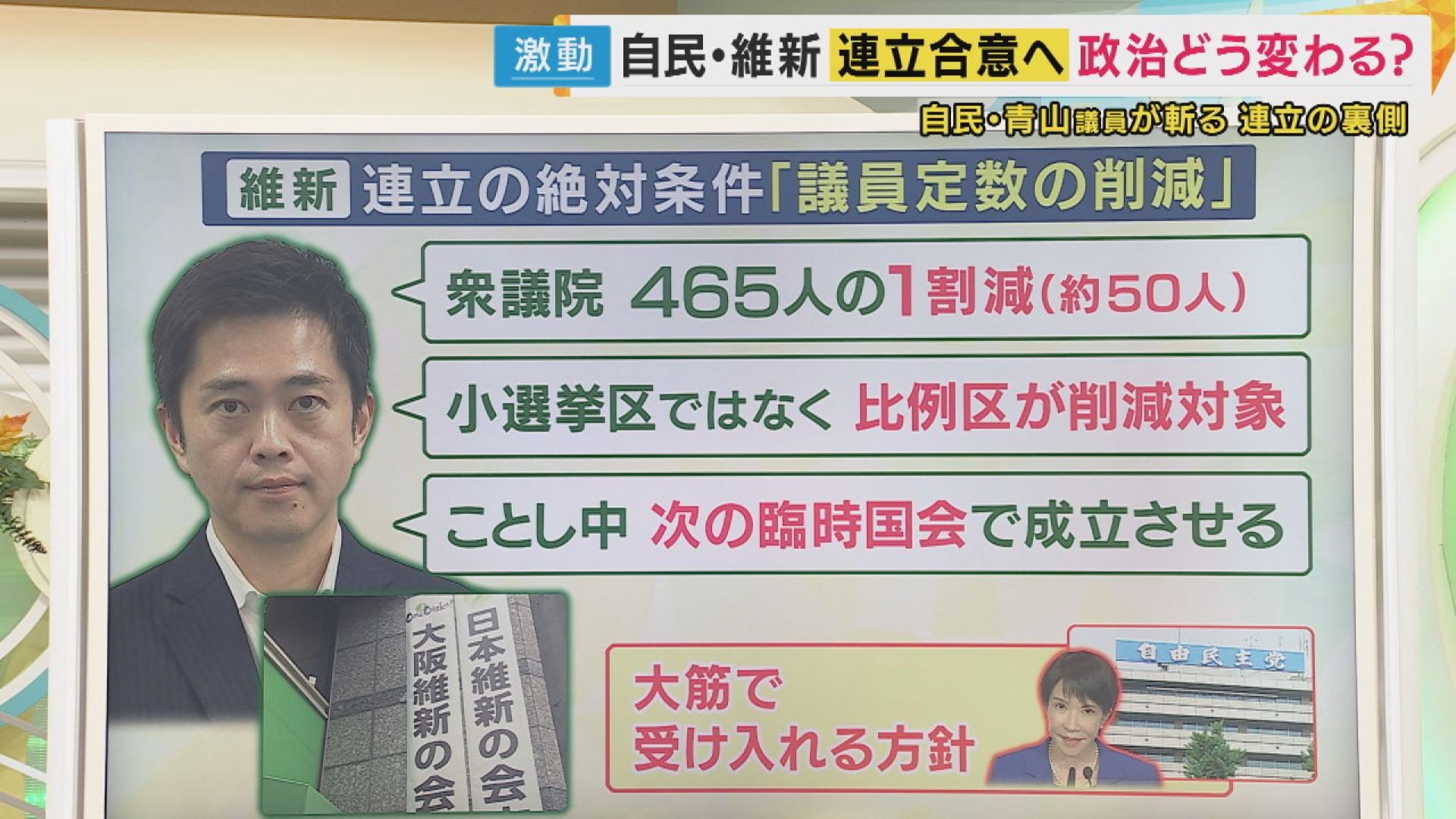 【吉原キャスター】「維新が求めたのは議員定数削減だけではなく、副首都構想・社会保険料の引き下げなど12項目がありました。自民とすると、要求を受け入れ過ぎではないかという声もありますがいかがでしょうか」