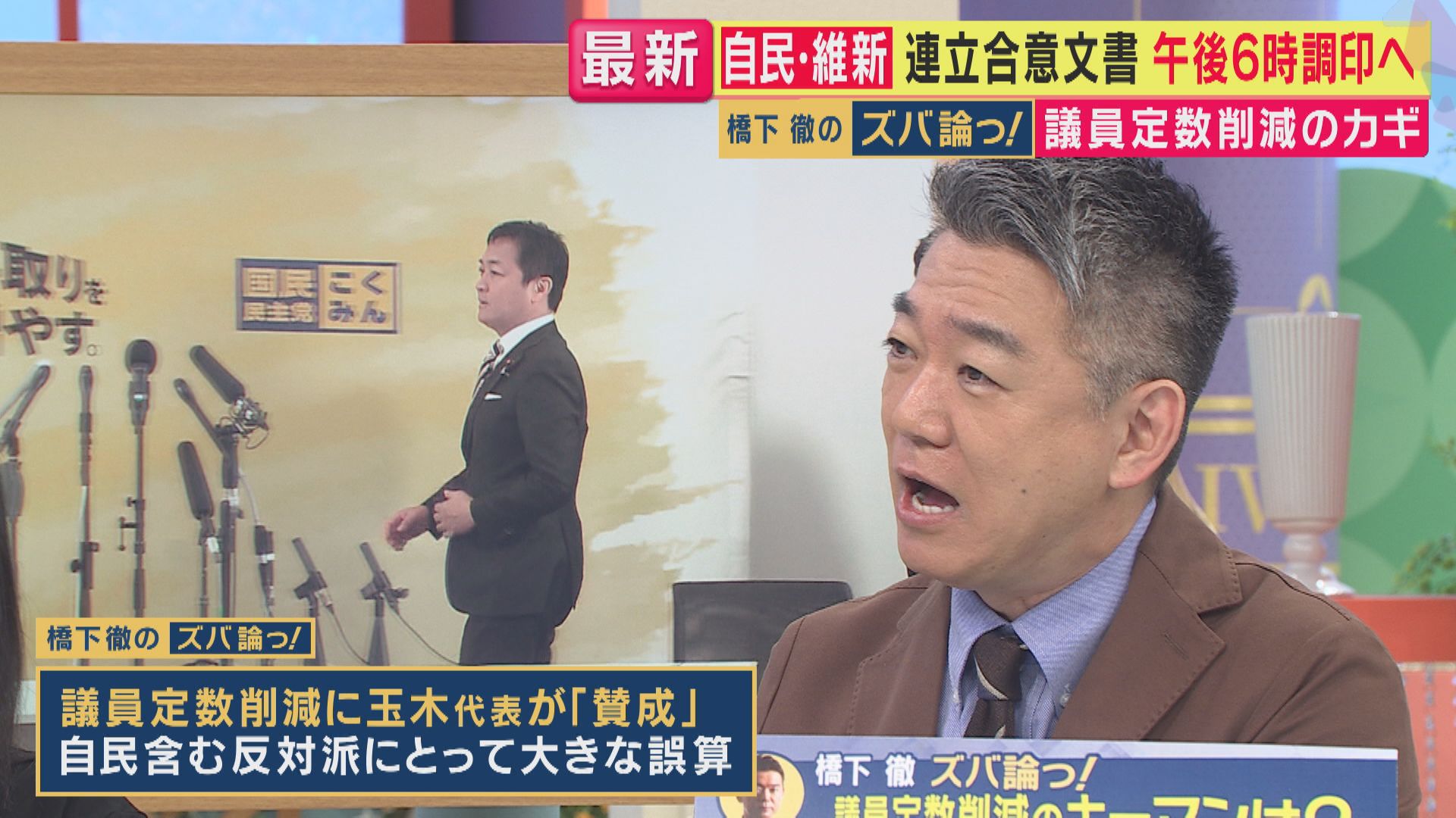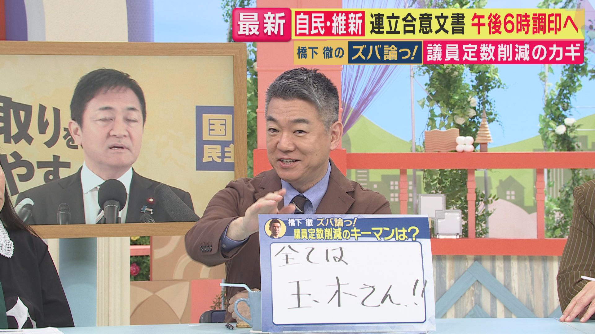 今回の連立に向けた協議で維新が掲げた「絶対条件」の一つである議員定数削減について、「旬感LIVE とれたてっ!」でに出演した橋下徹氏は、「全ては玉木さんにかかっている」と指摘。