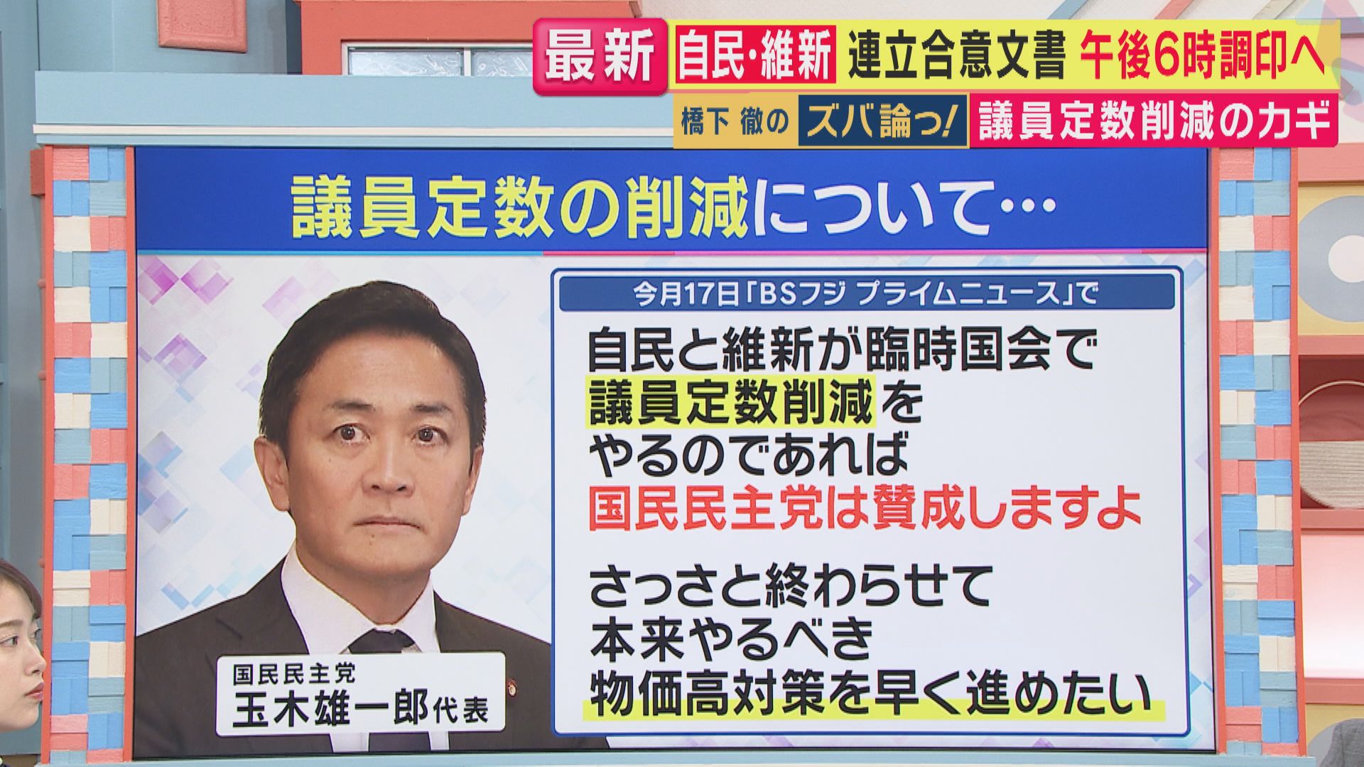国民民主党の玉木雄一郎代表がテレビ番組で「賛成する」と表明したことにより、実現に現実味が出てきたことを指摘するとともに、「議員定数削減(の法案)を出すと、これだけで国会は終わってしまいます。野党はみんな反対しているから。『さっさと終わらせて物価高対策をやりましょう』と言った玉木代表は合理的」と評しました。