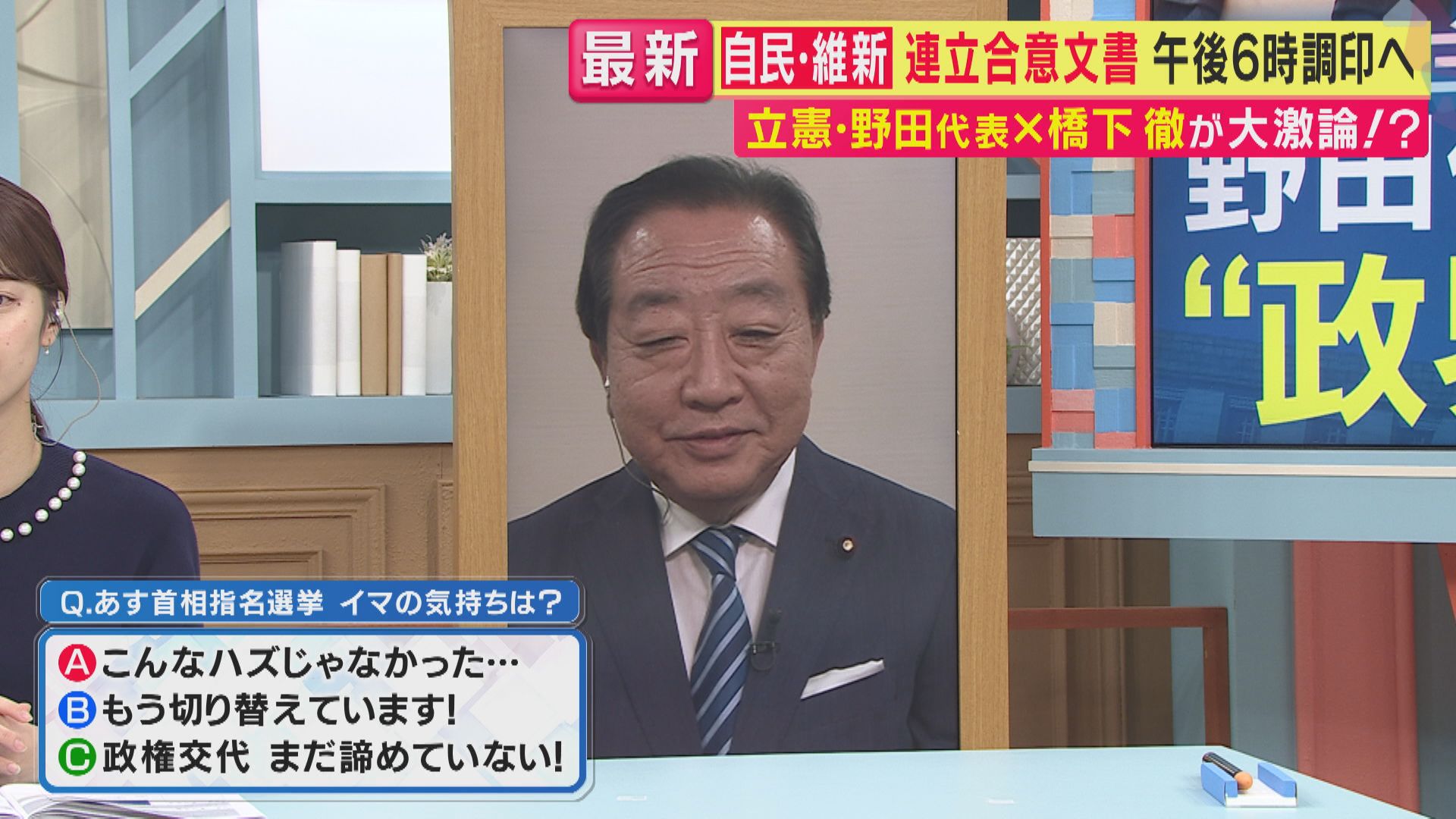 自民党と日本維新の会が連立政権の樹立へ合意する見通しとなった中、関西テレビ「旬感LIVE とれたてっ!」に、立憲民主党の野田佳彦代表が出演。