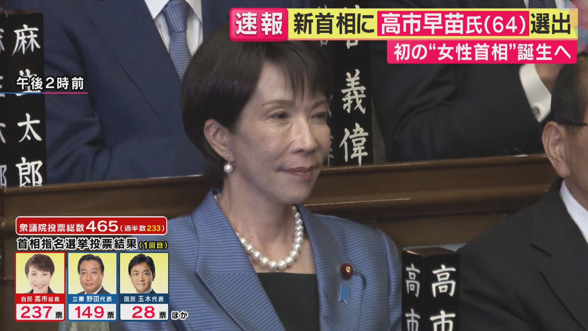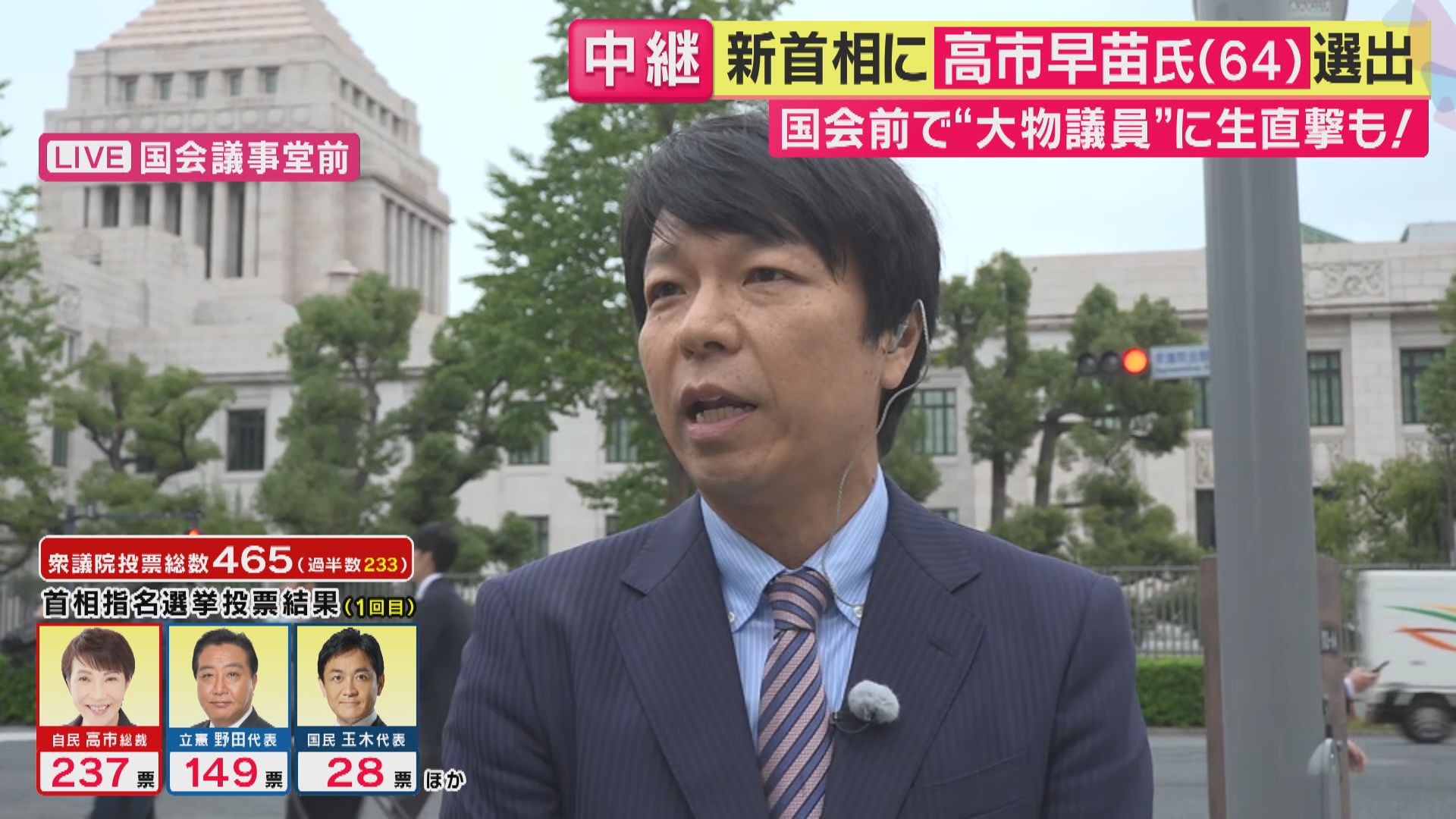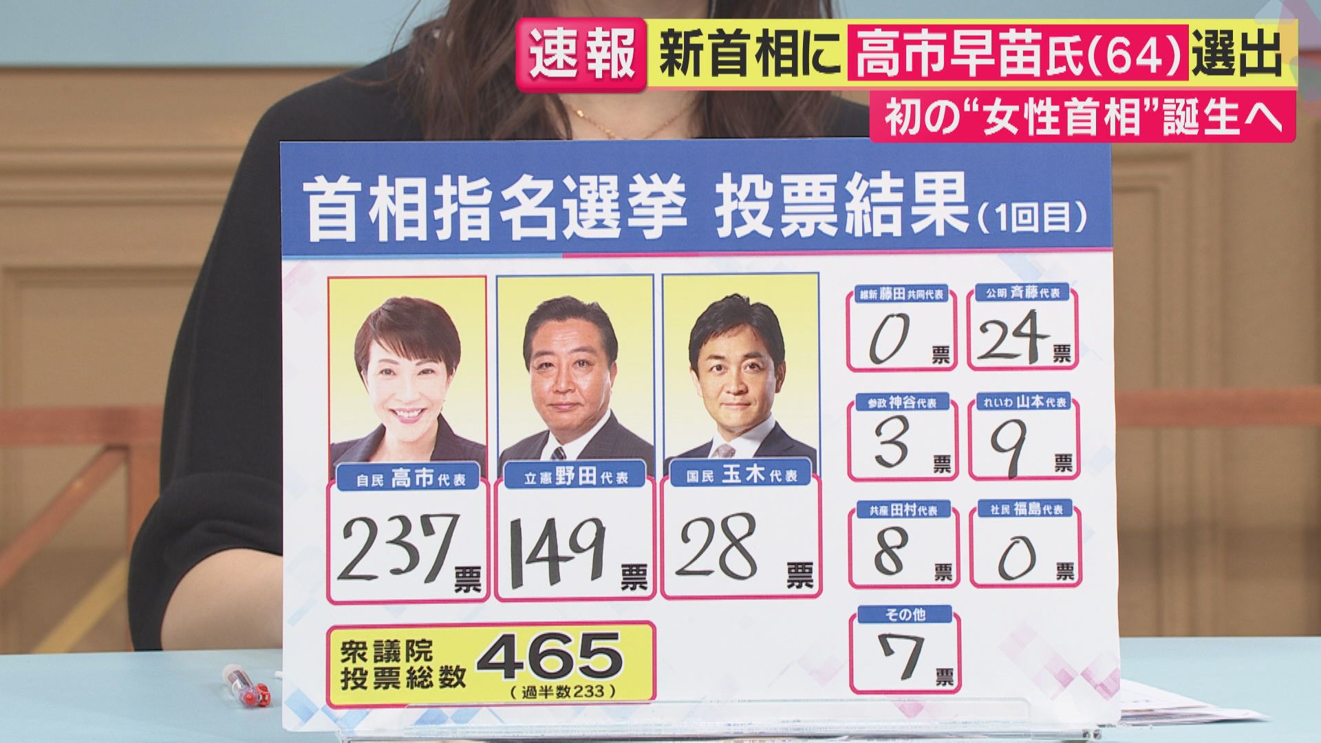 高市氏が237票で1回目の投票で過半数を超え、立憲民主党の代表は149票、国民民主党の玉木代表は28票という結果になりました。